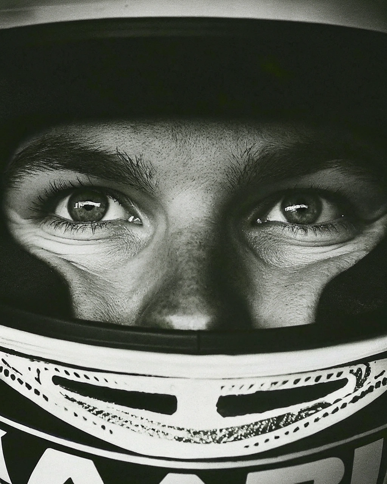 Close-up of a person's intense eyes framed by a helmet, showcasing focus and determination in a black-and-white composition.