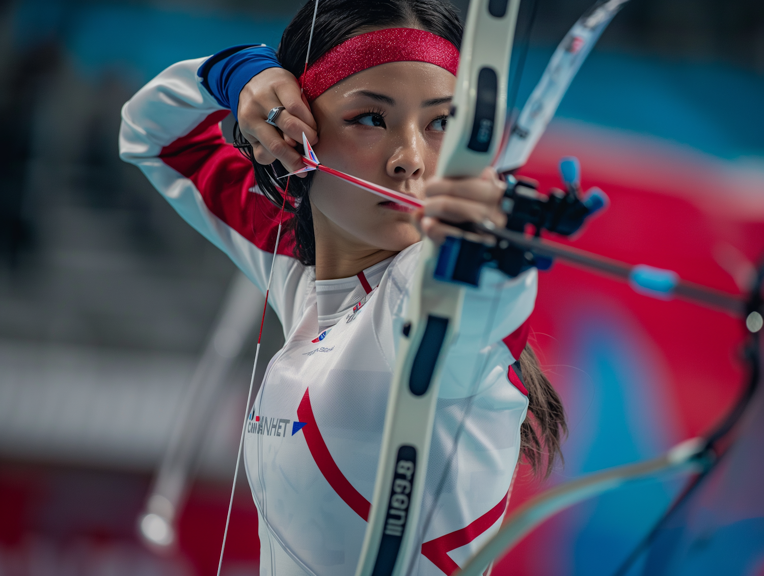 Focused female archer in action, wearing a red headband and white uniform, drawing her bowstring with precision against a blurred background.