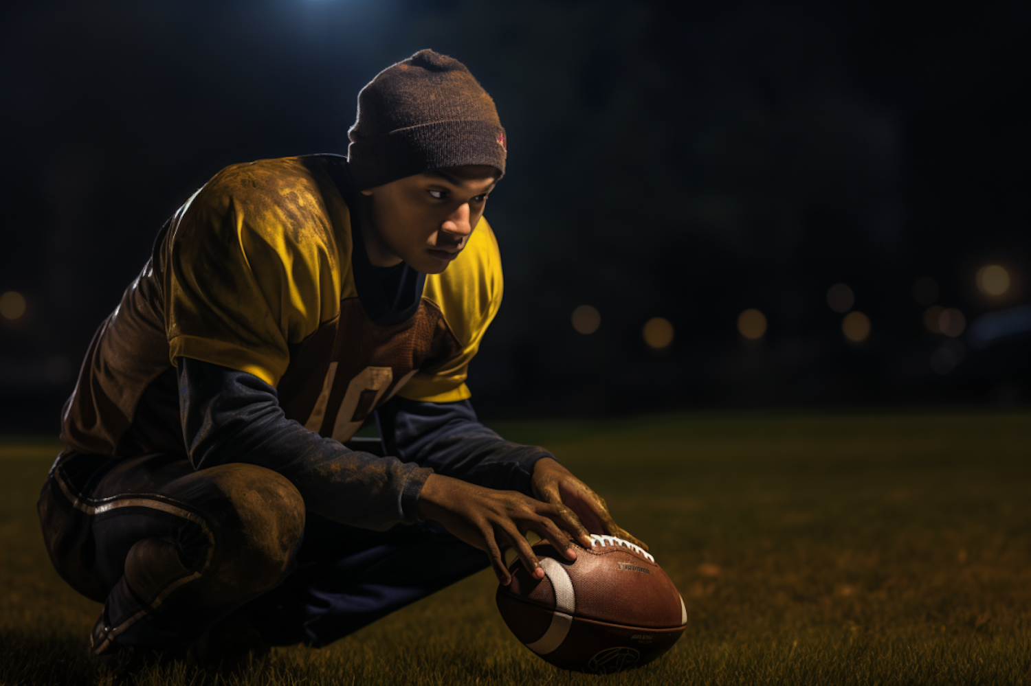 Focused football player in yellow jersey crouches on dimly lit field, holding ball with determination. Night practice ambiance.