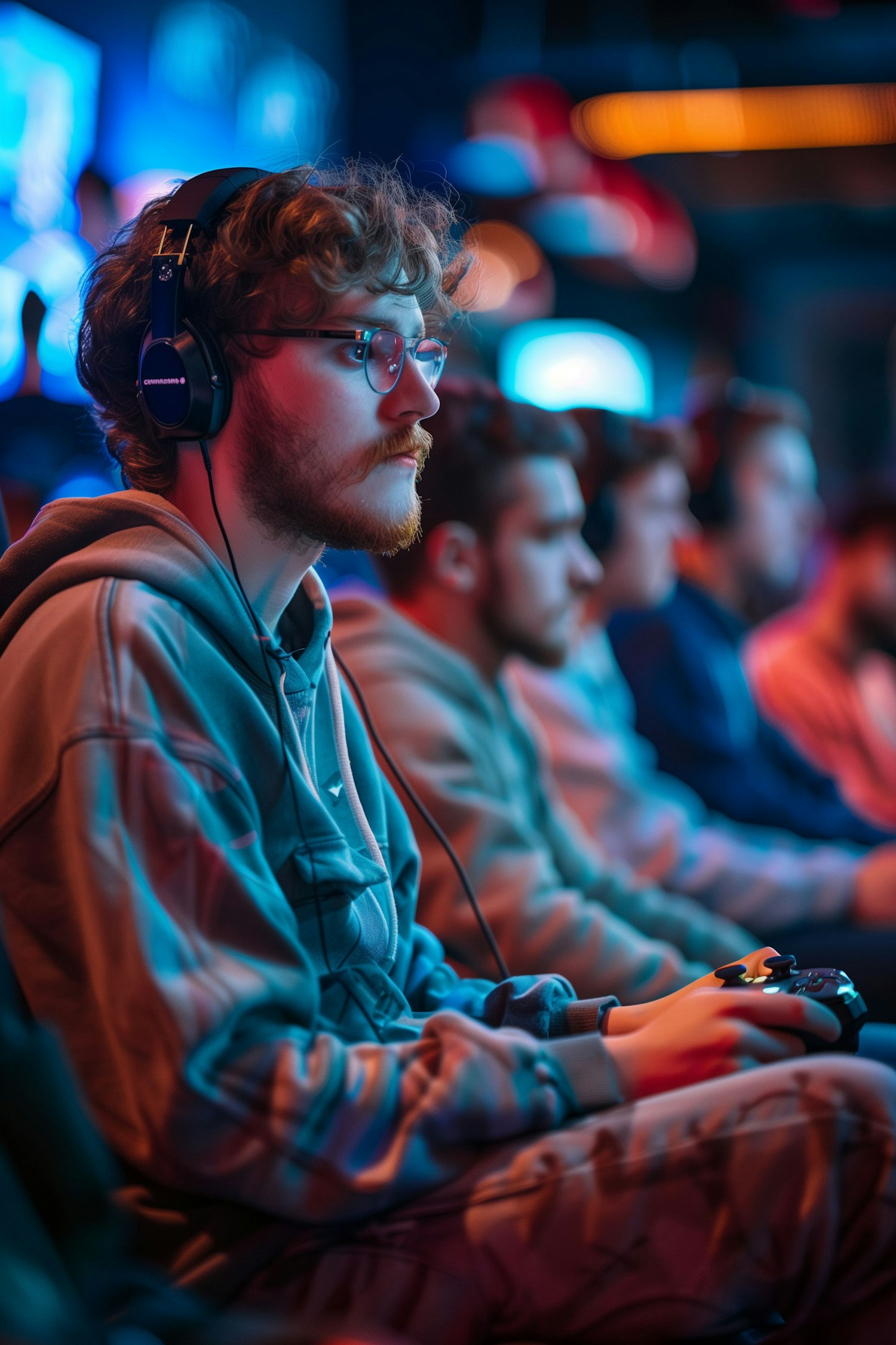 Young men gaming intensely in a vibrant, colorful setting, highlighting competitive esports atmosphere.