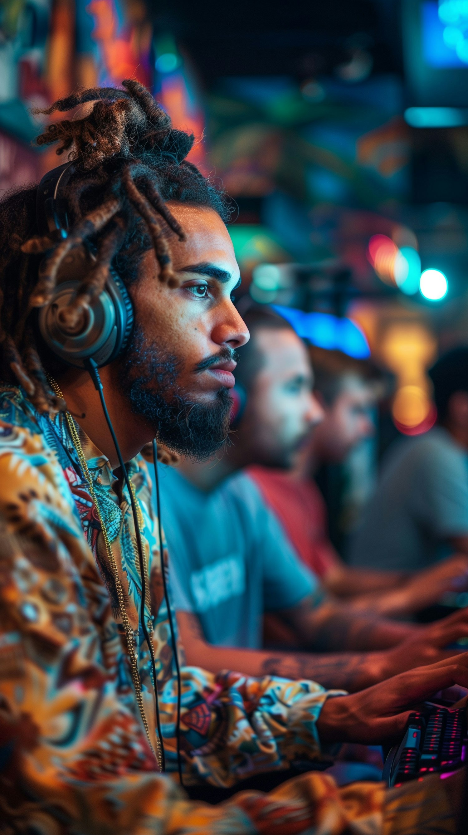 Young man with dreadlocks gaming intensely, wearing headphones and a colorful shirt in a vibrant, tech-filled environment.