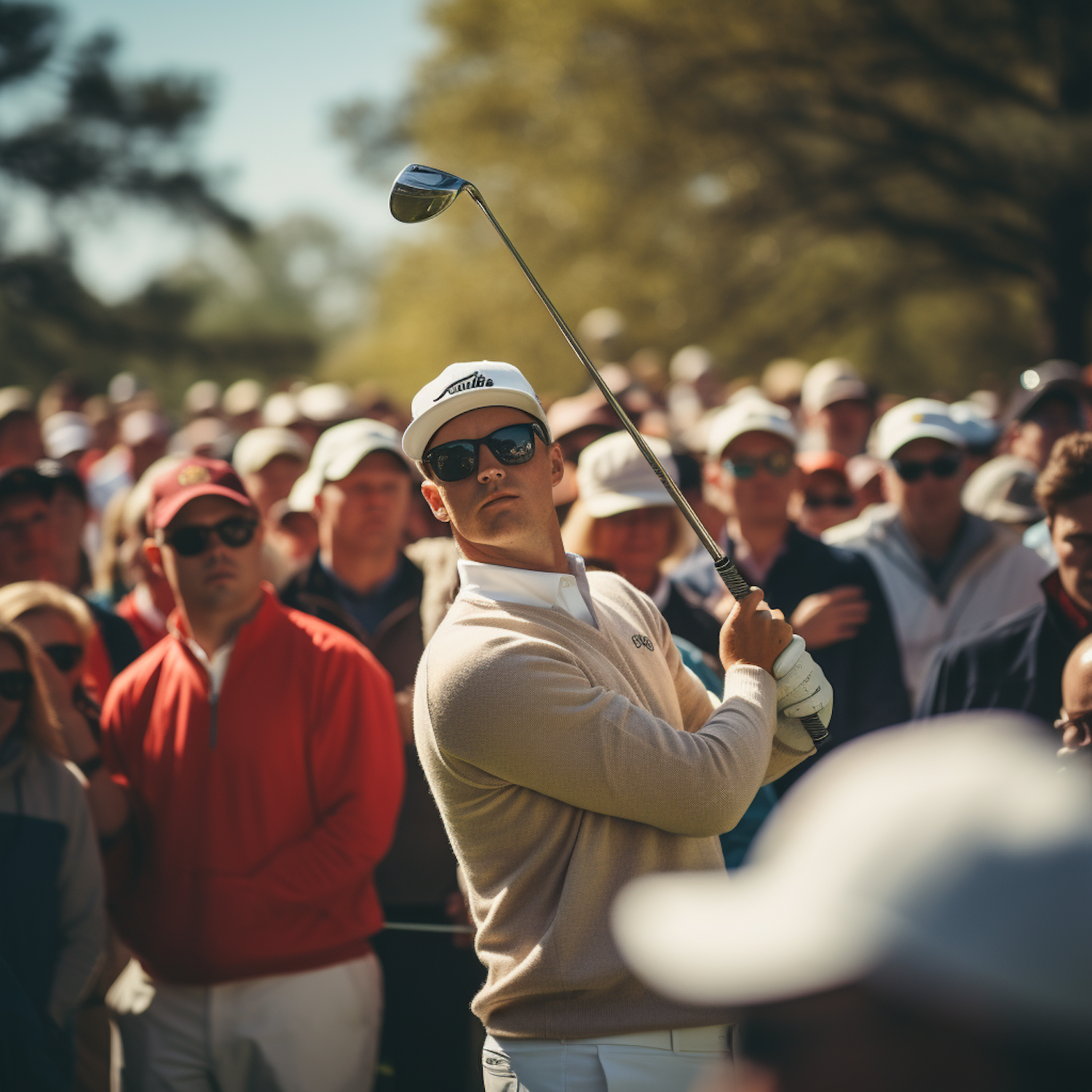 Golfer in beige sweater mid-swing, surrounded by an attentive crowd on a sunny day, capturing the excitement of the game.