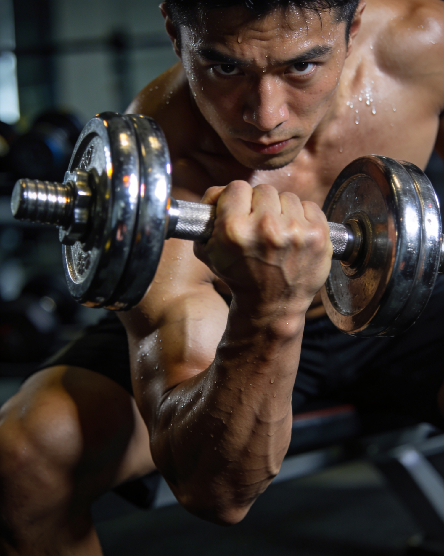 A muscular individual is performing a bicep curl with a dumbbell in a gym setting. The person has a focused expression, with sweat visible on their face and body, indicating intense effort. The lighting highlights the definition of their muscles, emphasizing the physical exertion. The background is blurred, with gym equipment faintly visible, keeping the focus on the subject. The dumbbell is metallic, reflecting the light, adding to the dynamic feel of the image. The overall composition conveys strength, determination, and dedication to fitness.