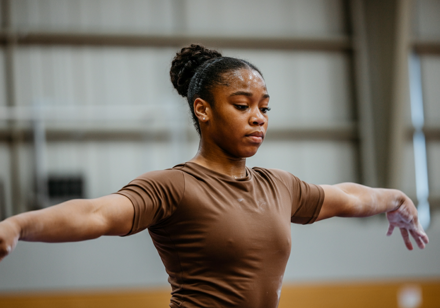 Focused gymnast with arms extended, wearing a brown athletic shirt in a gym. Chalk-dusted hands and sweat highlight her dedication.