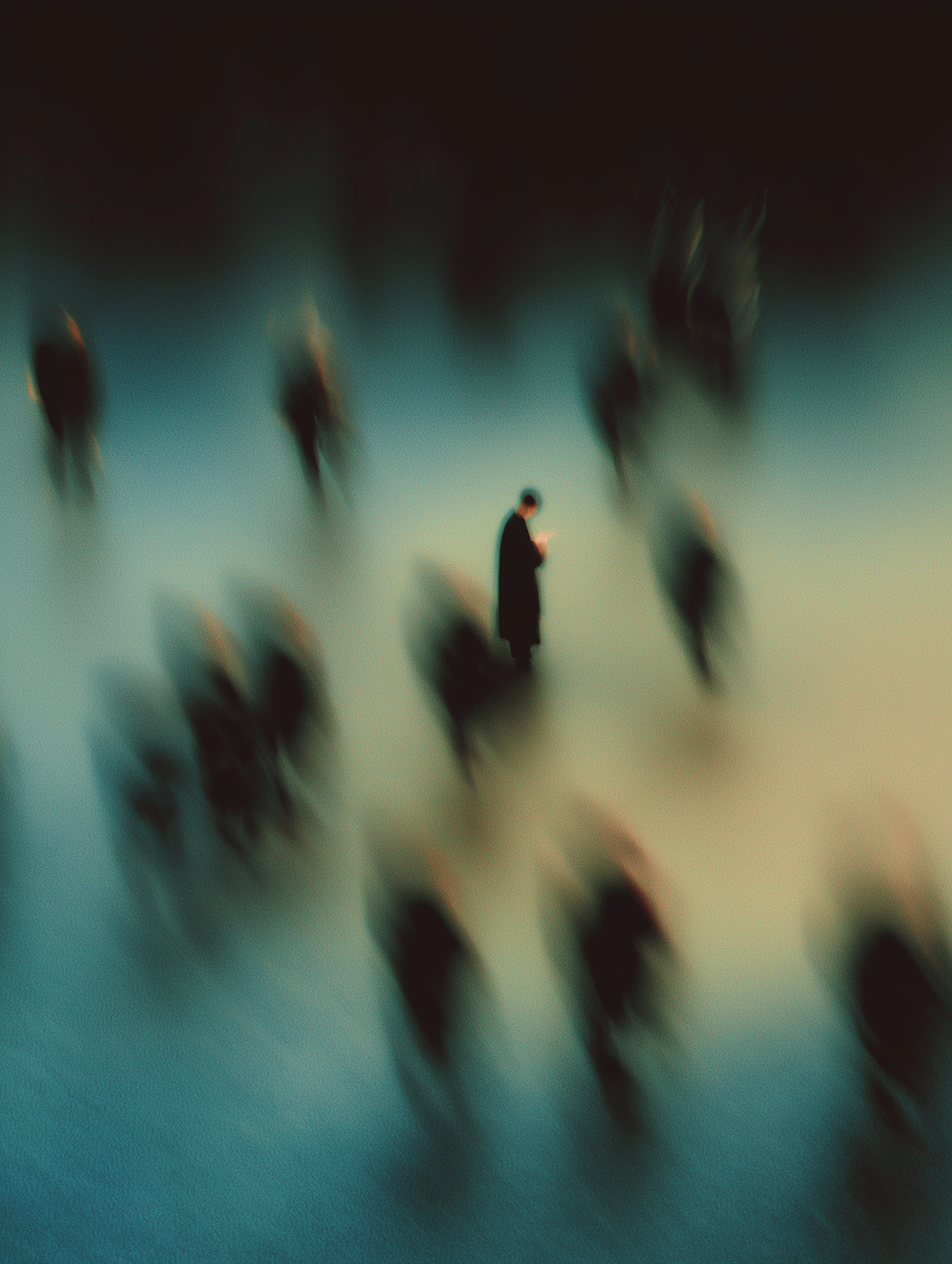A lone figure stands focused amidst a blurred, moving crowd, creating a striking contrast of stillness and motion in a surreal setting.