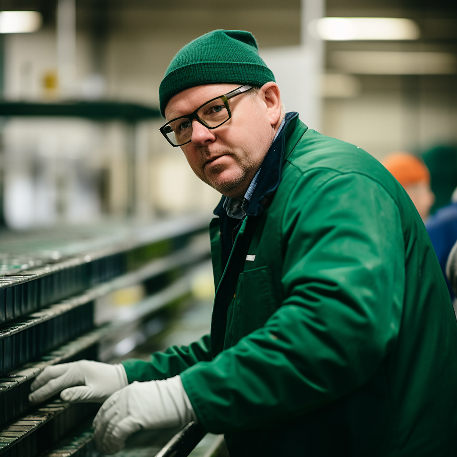 Focused factory worker in green attire and gloves handling items on a production line in an industrial setting.