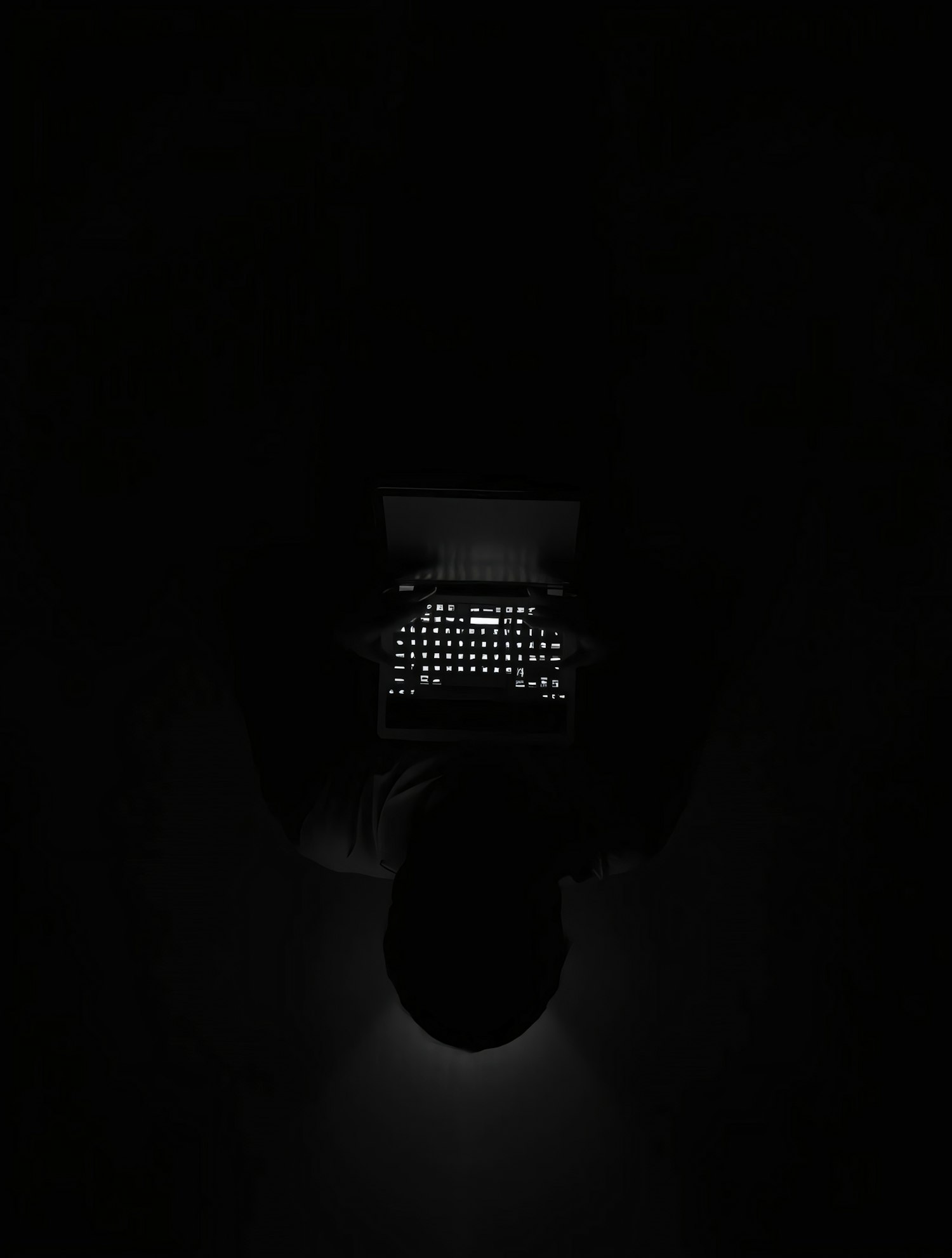 A person in a dark room illuminated by a glowing laptop keyboard, creating a dramatic and focused atmosphere.