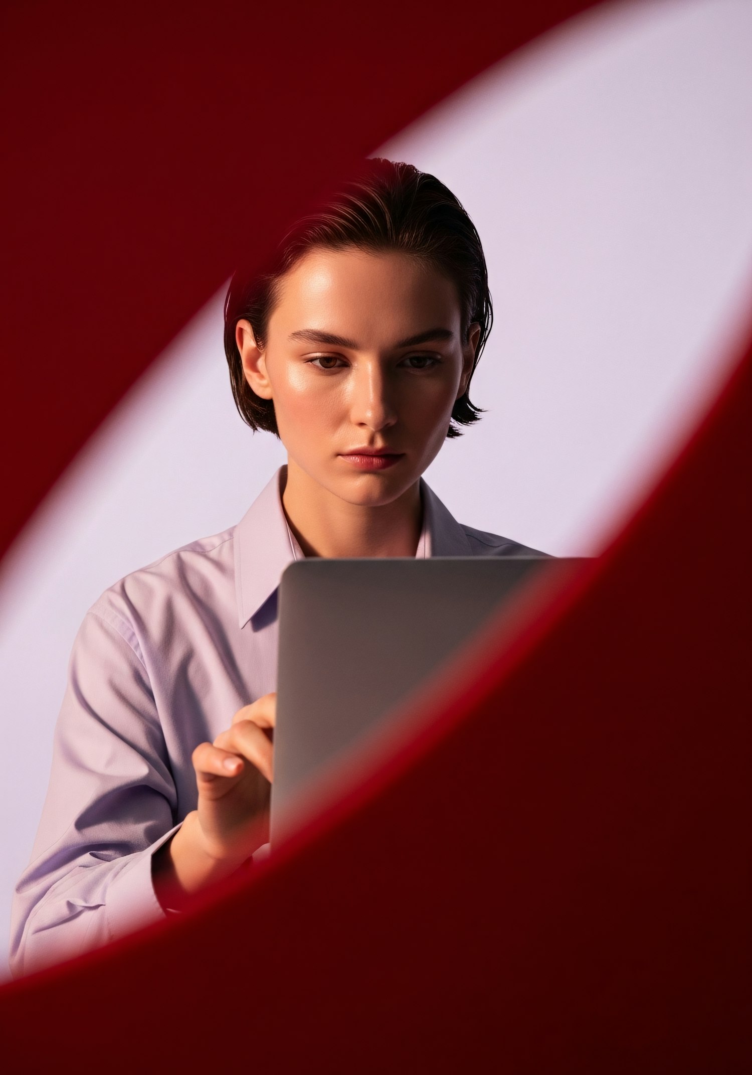 A focused individual working on a laptop, framed by a bold red foreground, creating a modern and dynamic composition.