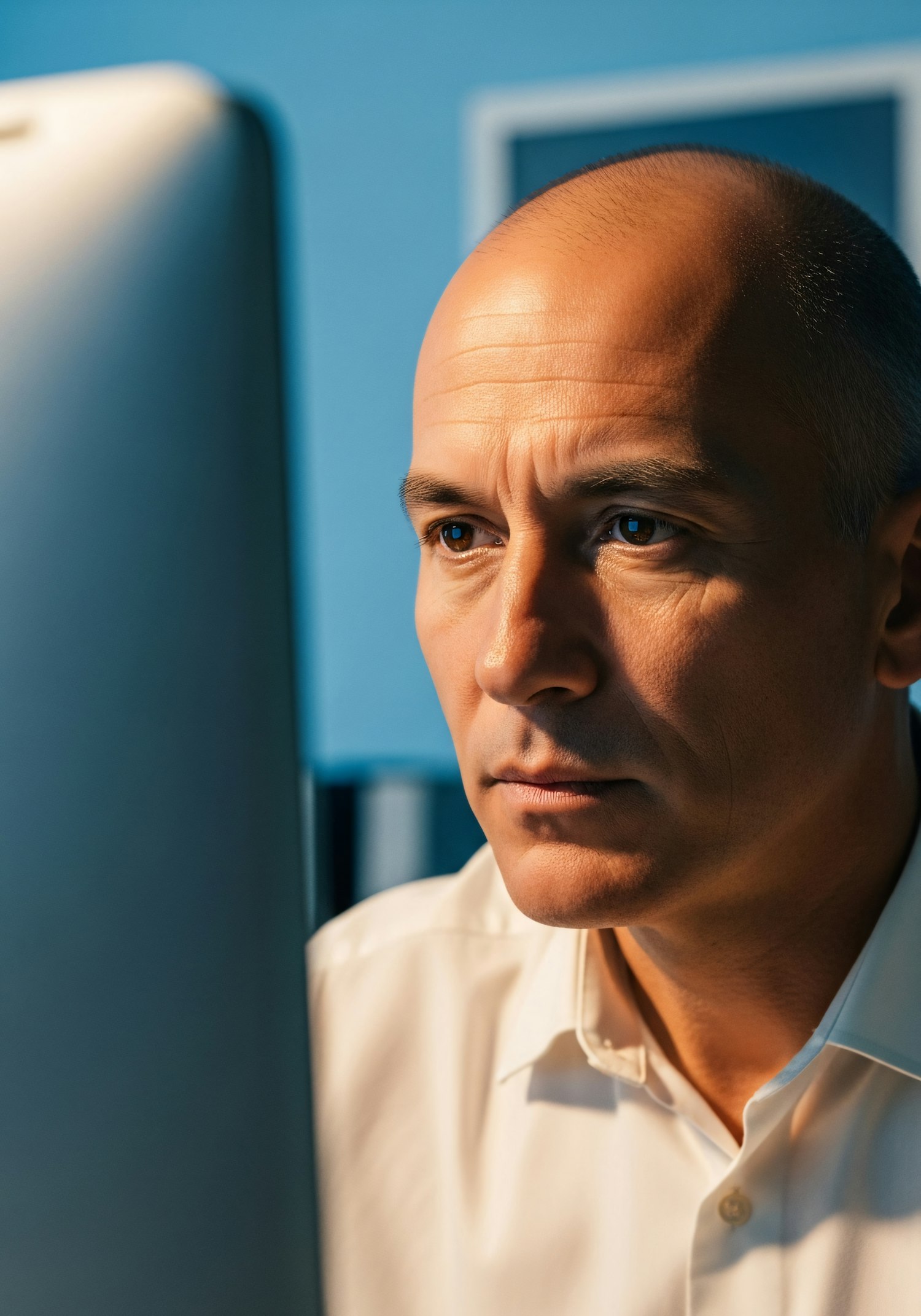 A man in a white shirt focuses on a computer screen, with a blue background softly blurred behind him.