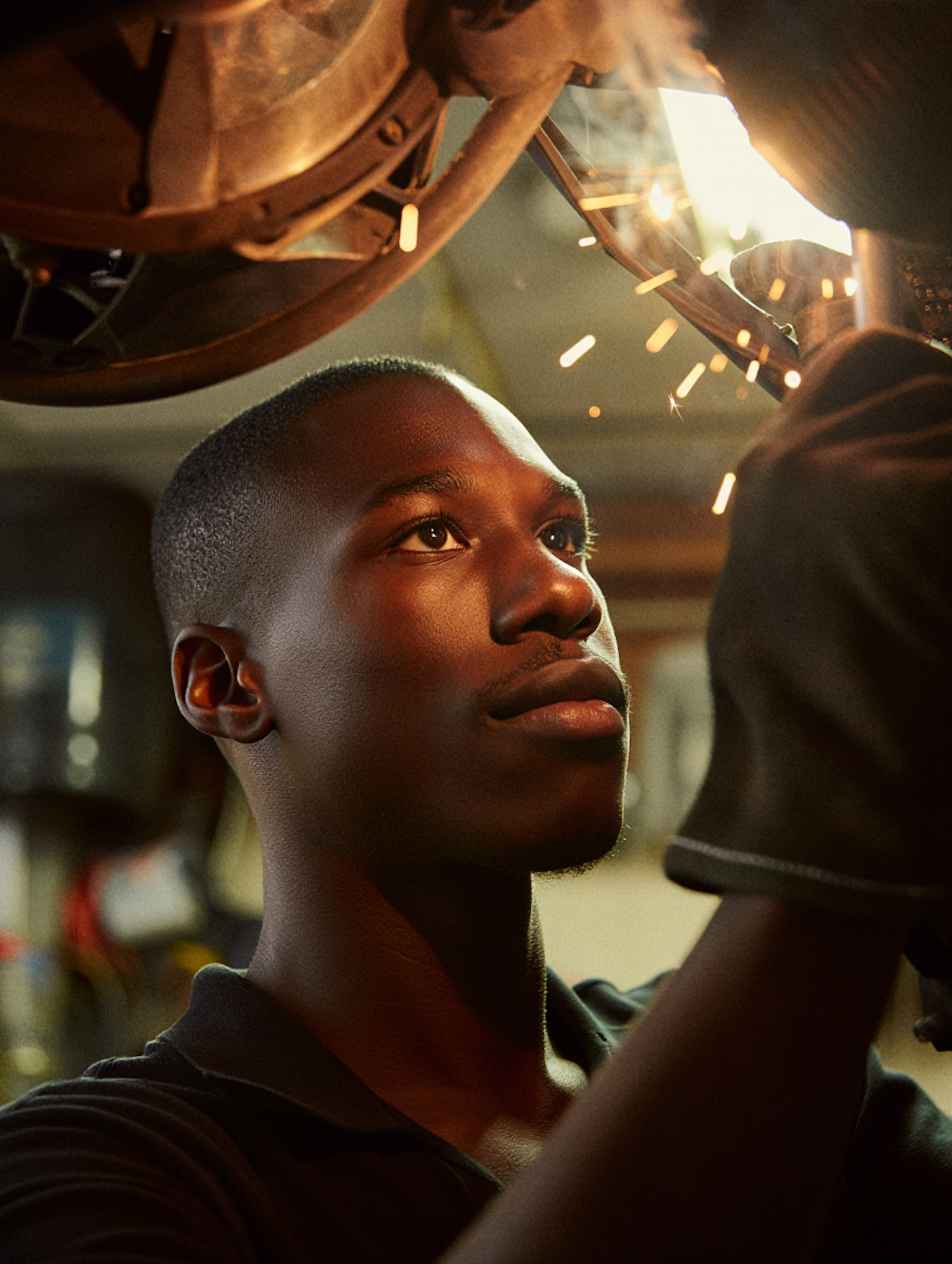 Focused mechanic working on machinery, sparks flying as he welds or repairs, showcasing skill and dedication in a workshop setting.