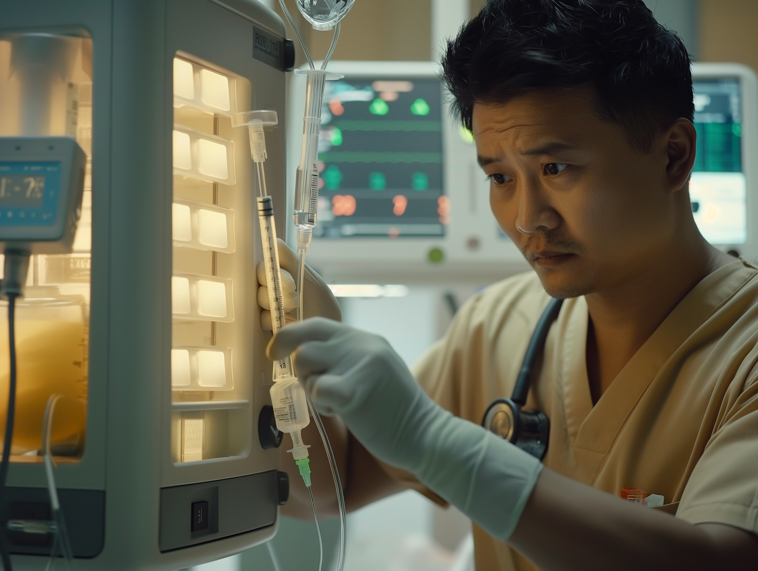 Asian male nurse adjusting IV drip in hospital, wearing beige scrubs and gloves, with medical monitors in the background.