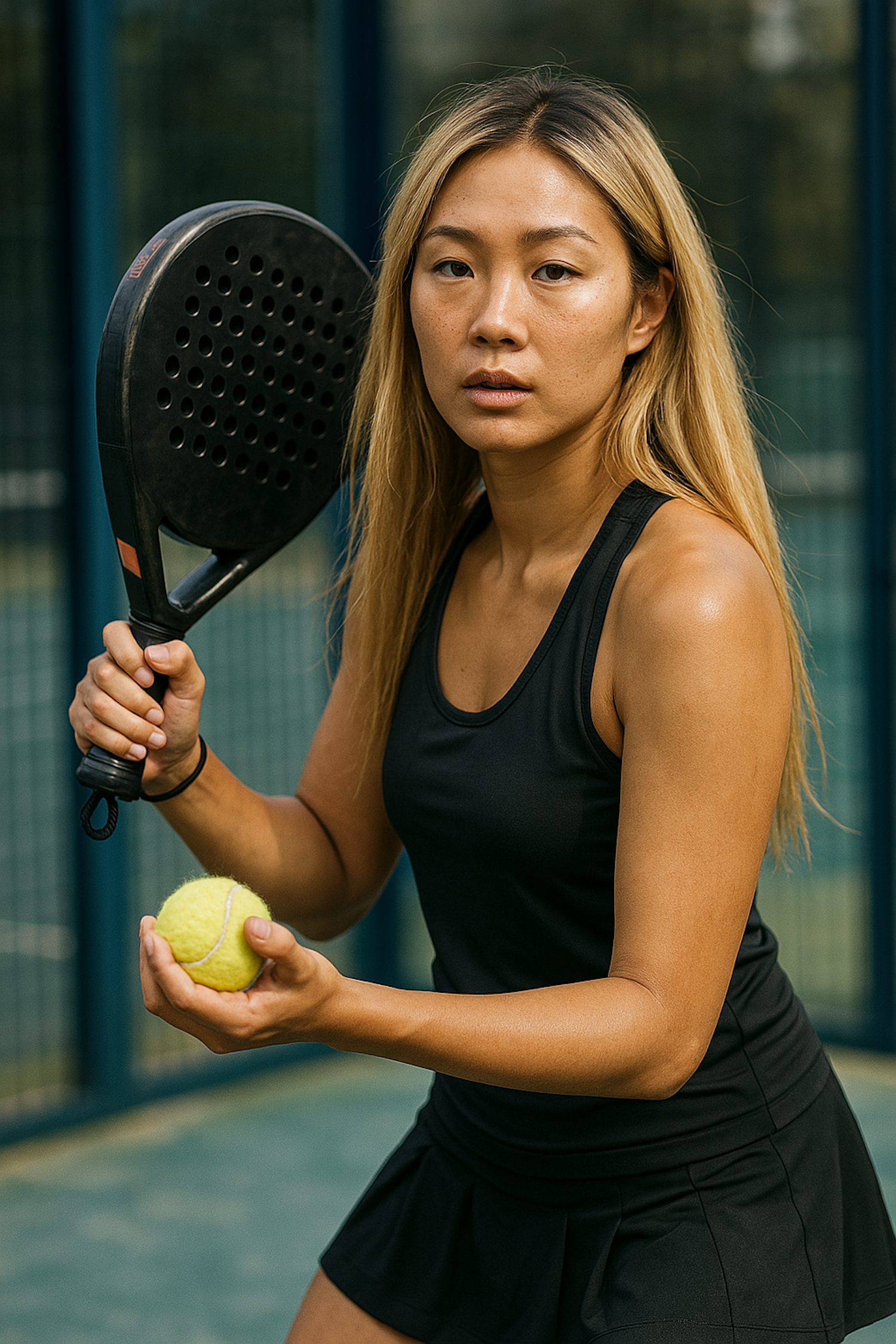Focused woman with blonde hair holding a paddle racket and tennis ball on a court, dressed in black athletic wear.