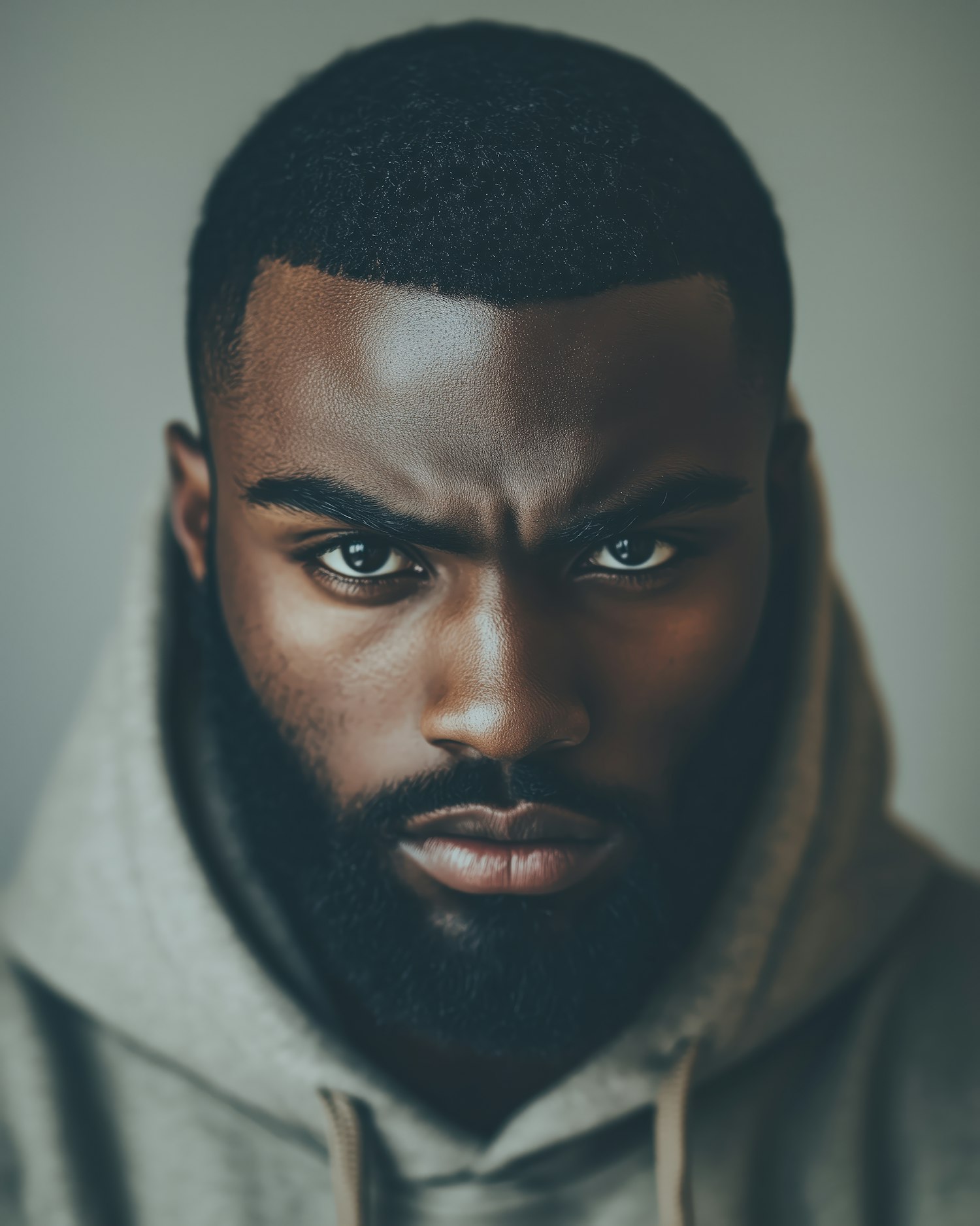 Close-up portrait of a man with a full beard, intense gaze, and gray hoodie, set against a neutral blurred background.
