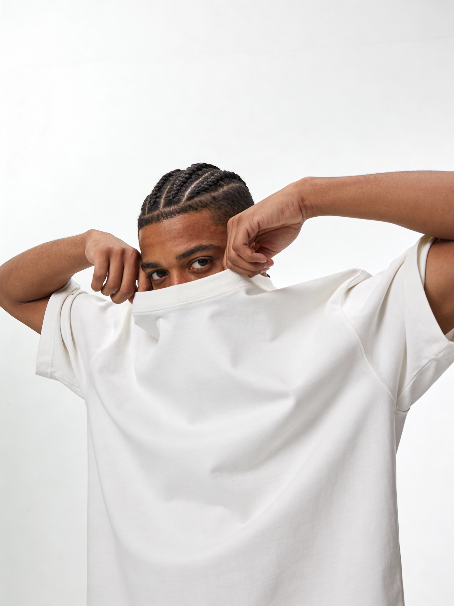 A person with braided hair and a white t-shirt partially covering their face, set against a plain white background.