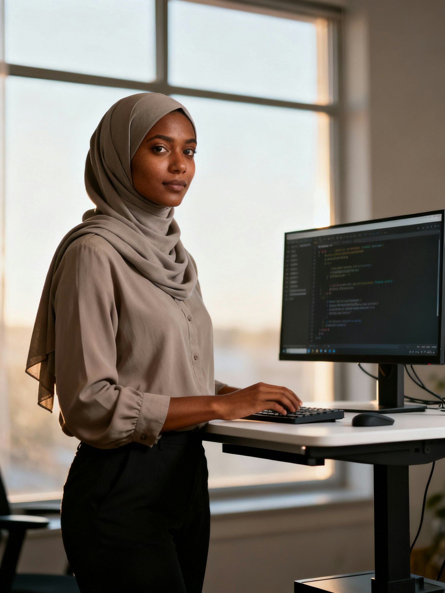 A professional woman in a beige hijab works at a standing desk with a coding monitor, in a bright, modern office setting.