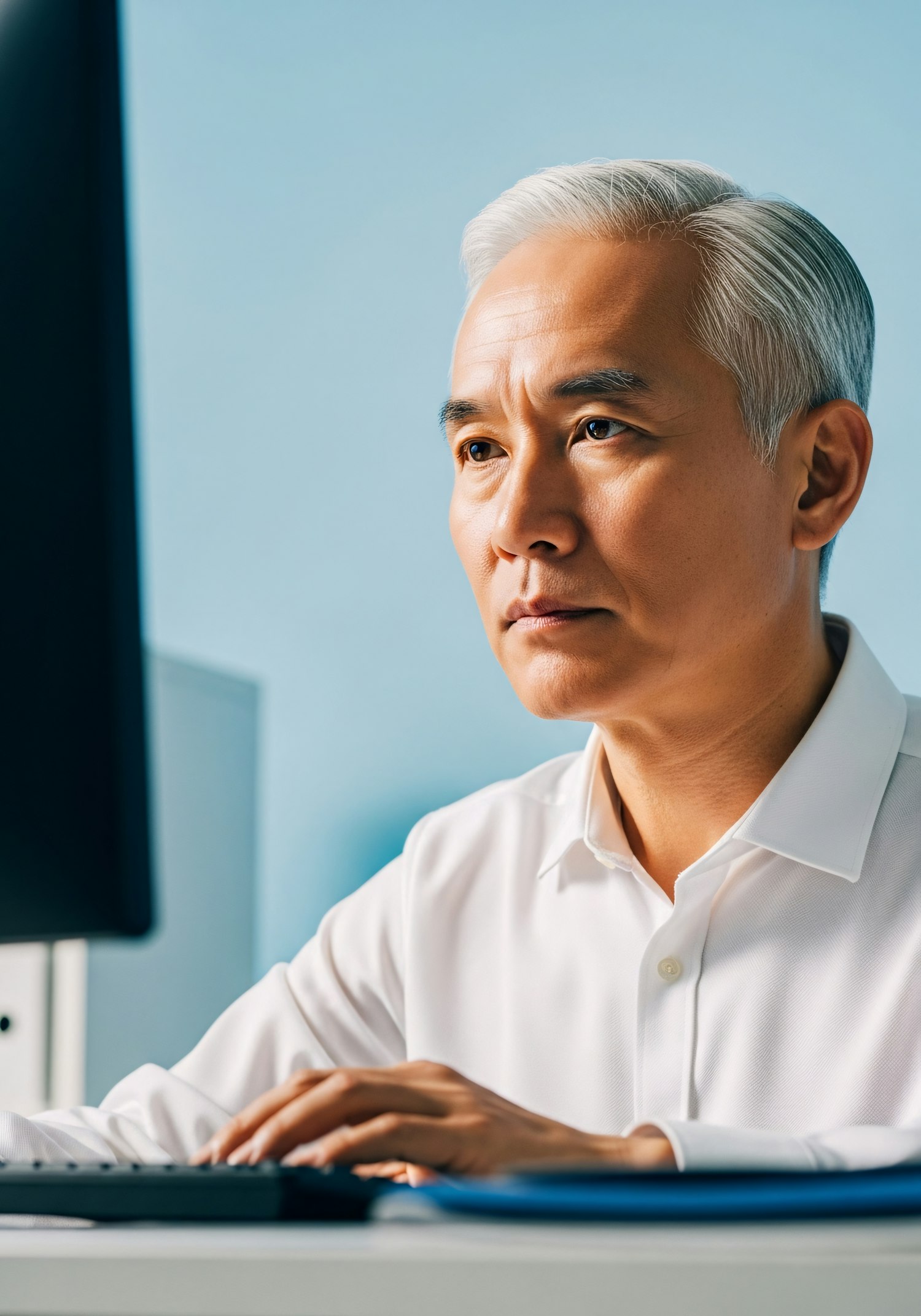 A focused man in a white shirt working at a computer, set against a calm blue background, conveying professionalism and concentration.