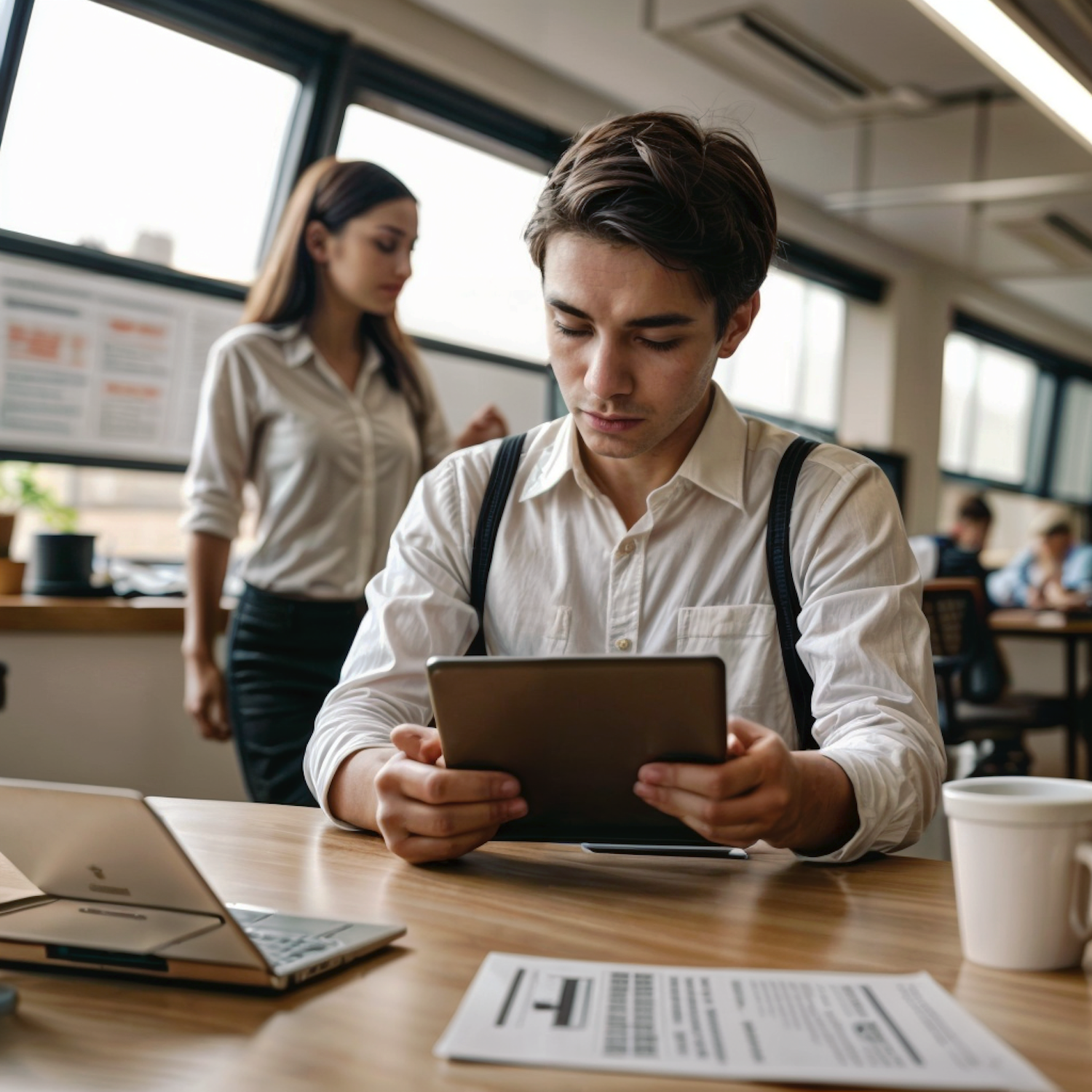 Young man focused on a tablet in a modern office, with a laptop and coffee on the desk, while a woman walks by in the background.