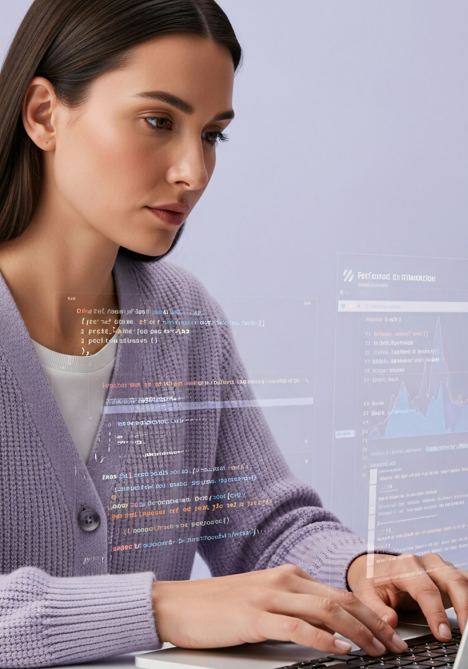 A woman working on a laptop with code and data visualizations overlayed, wearing a light purple cardigan in a minimalistic setting.