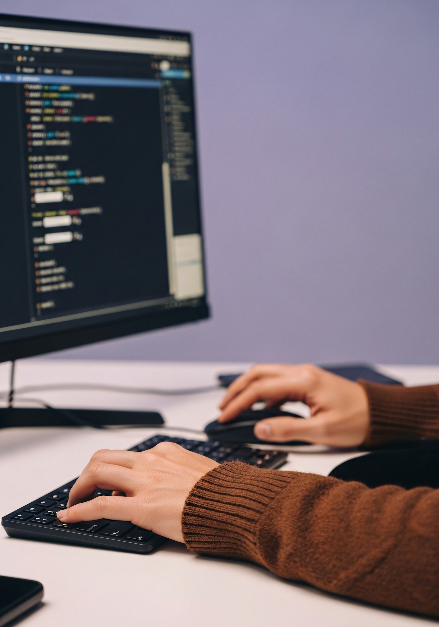 A programmer's hands typing on a keyboard with a code editor on the screen, set against a clean and minimalistic workspace.