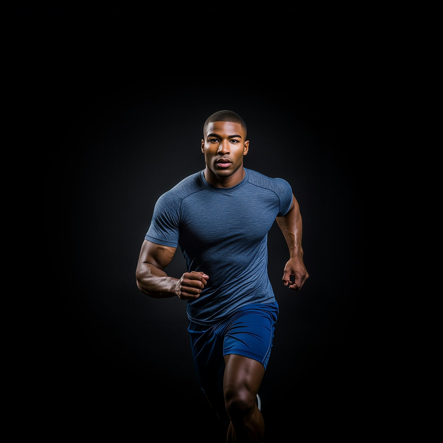 Athletic Black man running in a blue outfit against a black background, showcasing strength and determination.
