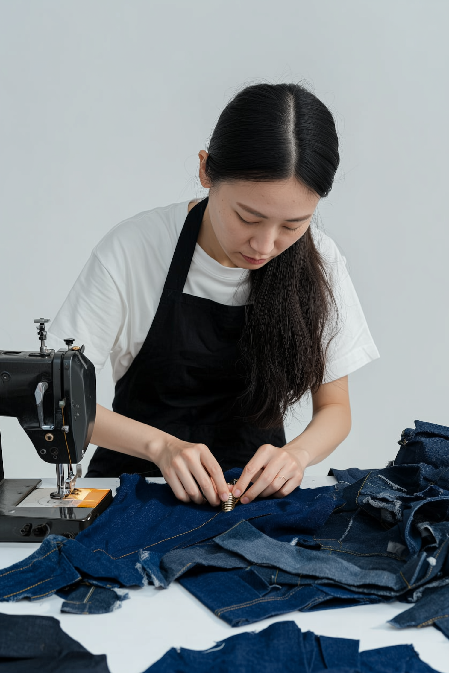 A woman in a black apron works on denim fabric at a sewing station, showcasing craftsmanship and focus in a minimalist setting.