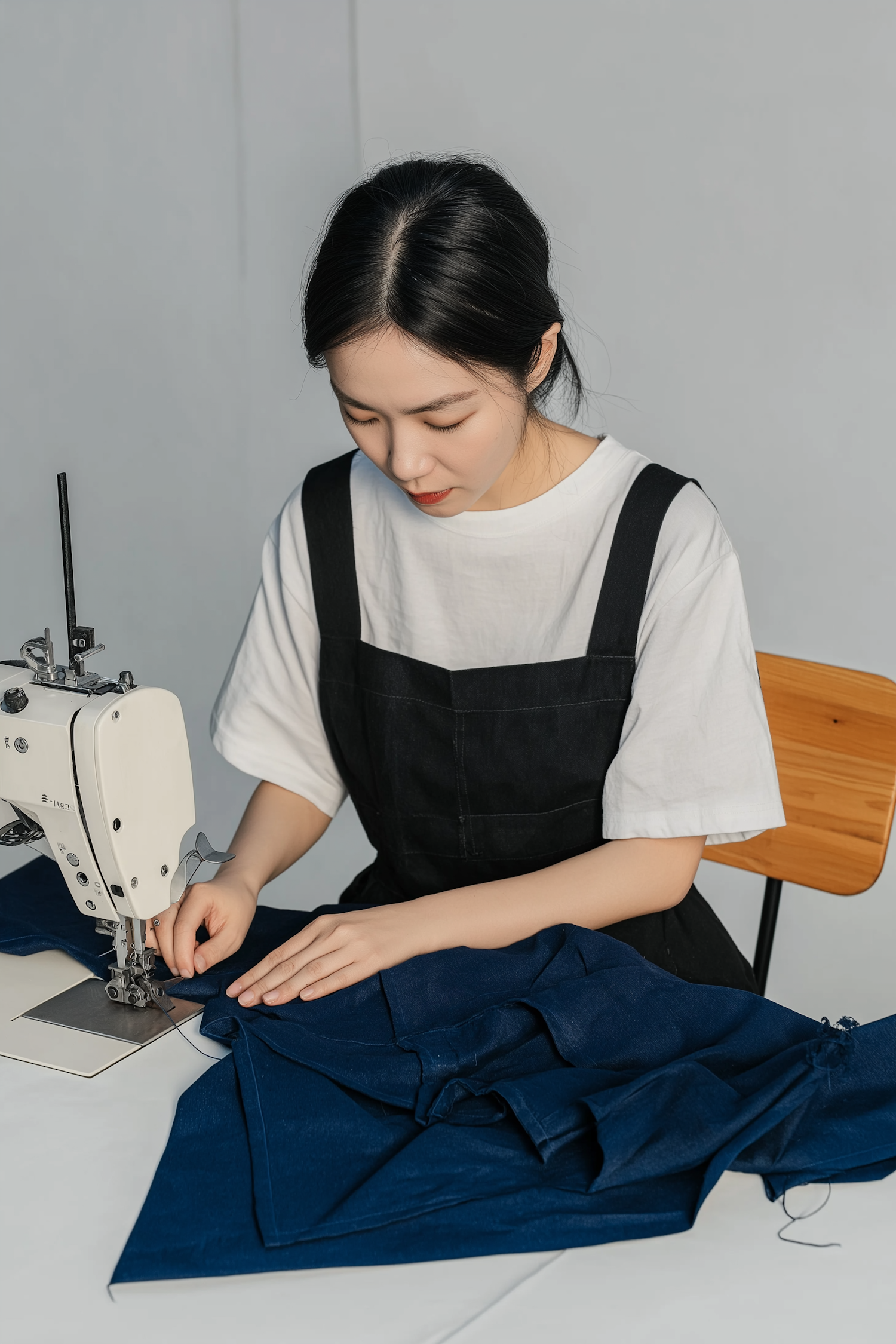 A woman sewing dark blue fabric on a machine, wearing a white shirt and black apron, focused on her work in a minimal setting.