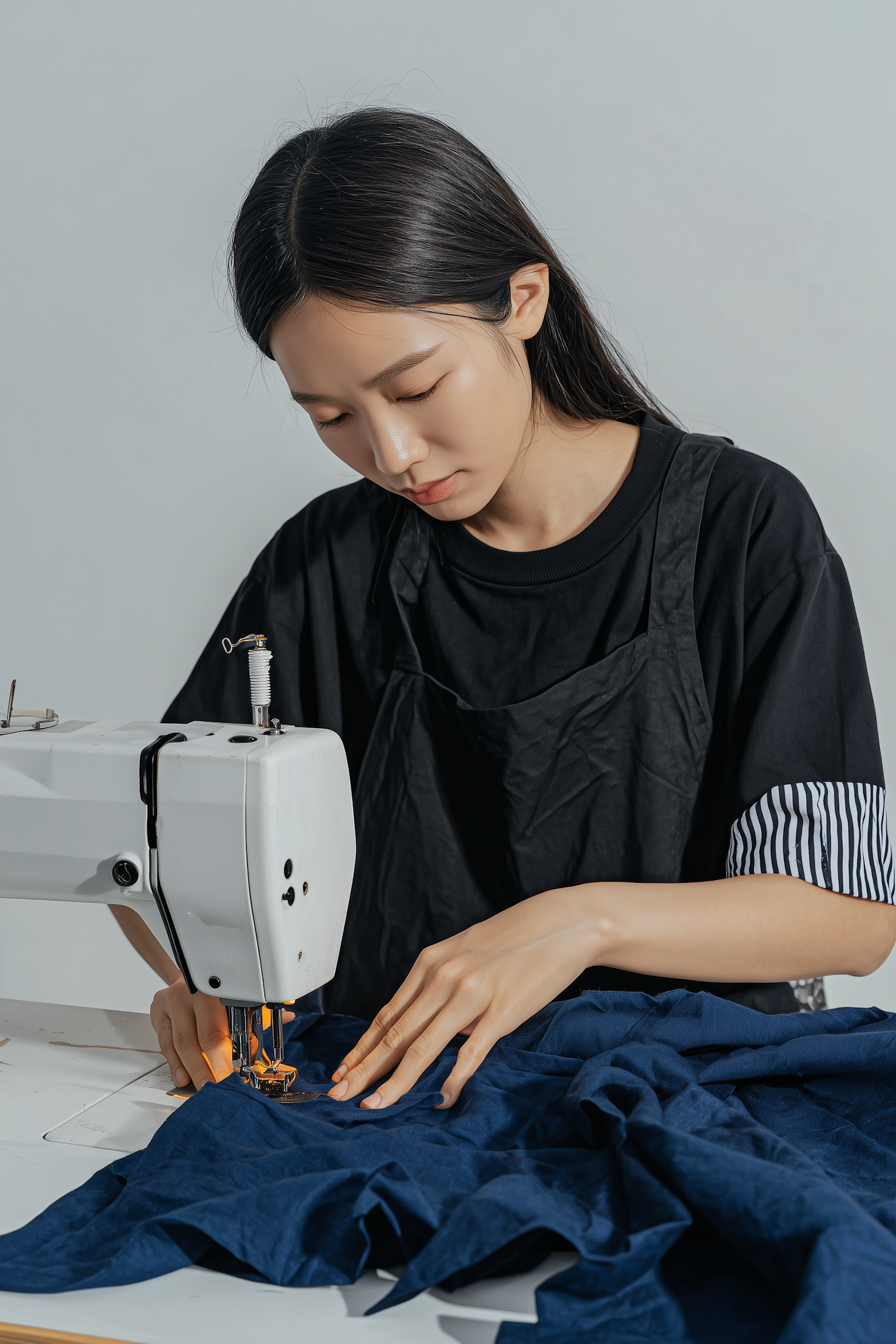 A woman sewing blue fabric on a white sewing machine, wearing a black shirt with striped details, in a minimalistic setting.
