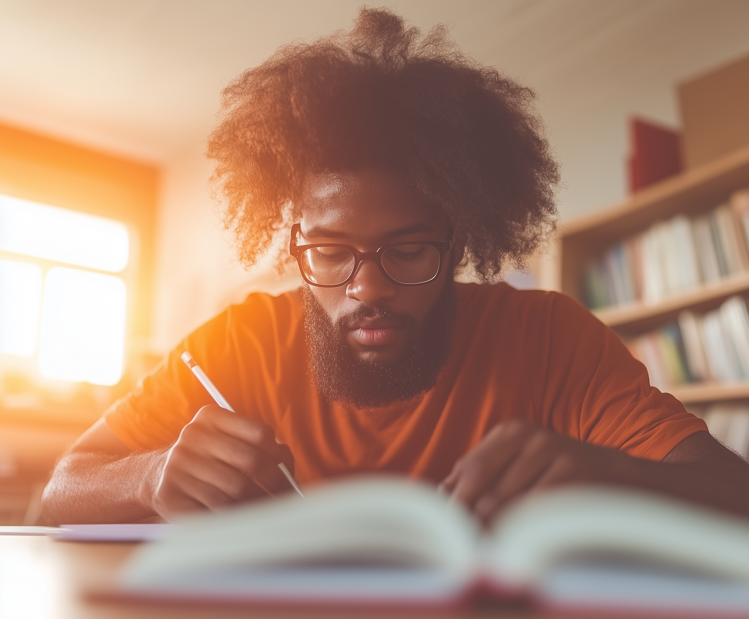 Young man with afro and glasses writing in a sunlit library, surrounded by books. Warm, focused study environment.