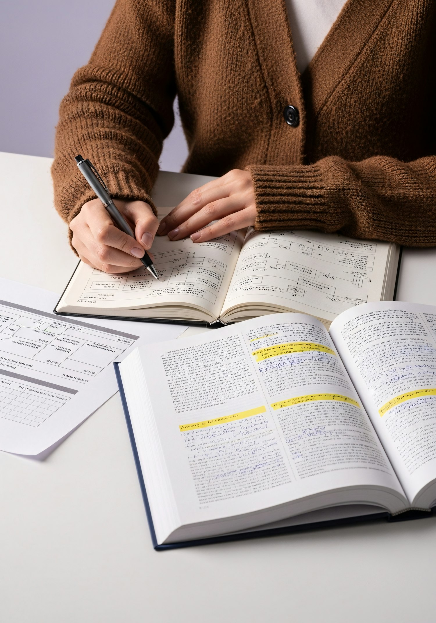 A person studies at a desk with open books, notes, and a pen, wearing a brown cardigan, creating a focused and academic atmosphere.