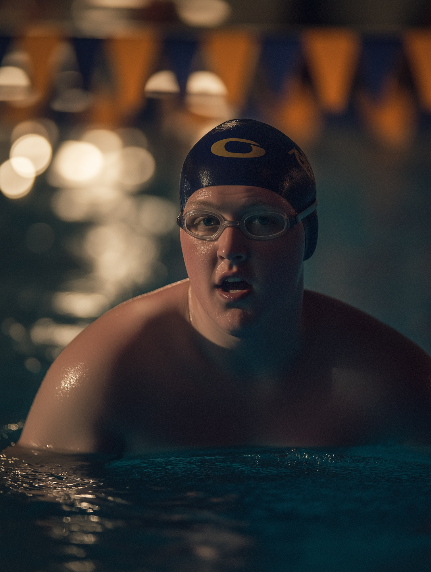 Focused swimmer in pool with dark cap and goggles, surrounded by colorful flags. Dramatic lighting highlights determination.