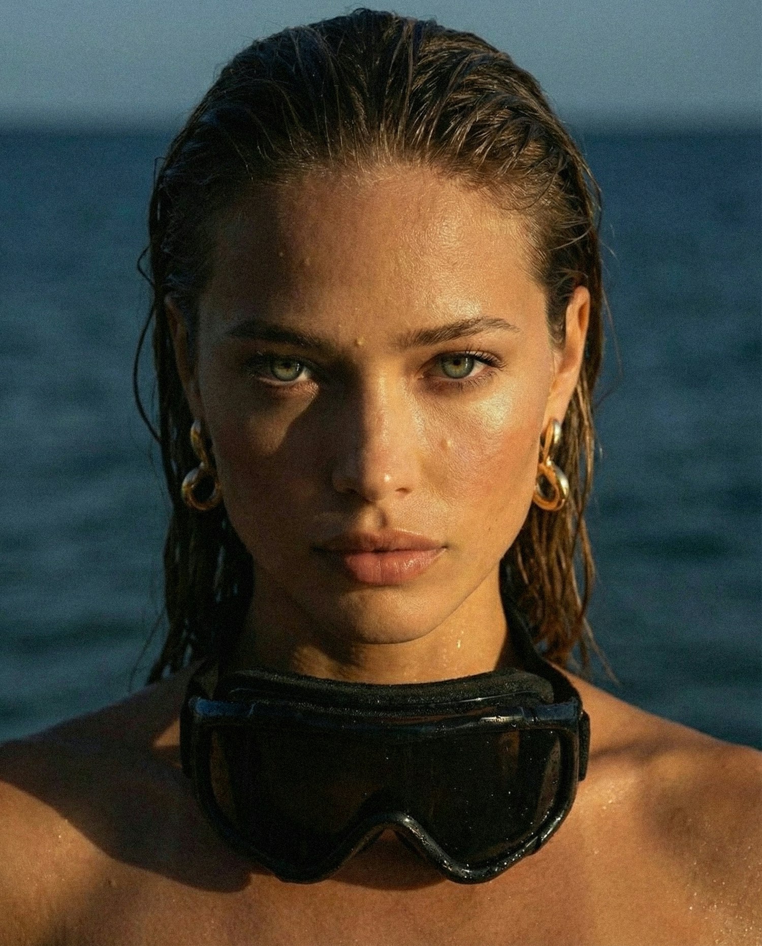 A person with wet hair and goggles around their neck stands by the water, their face illuminated by natural light.