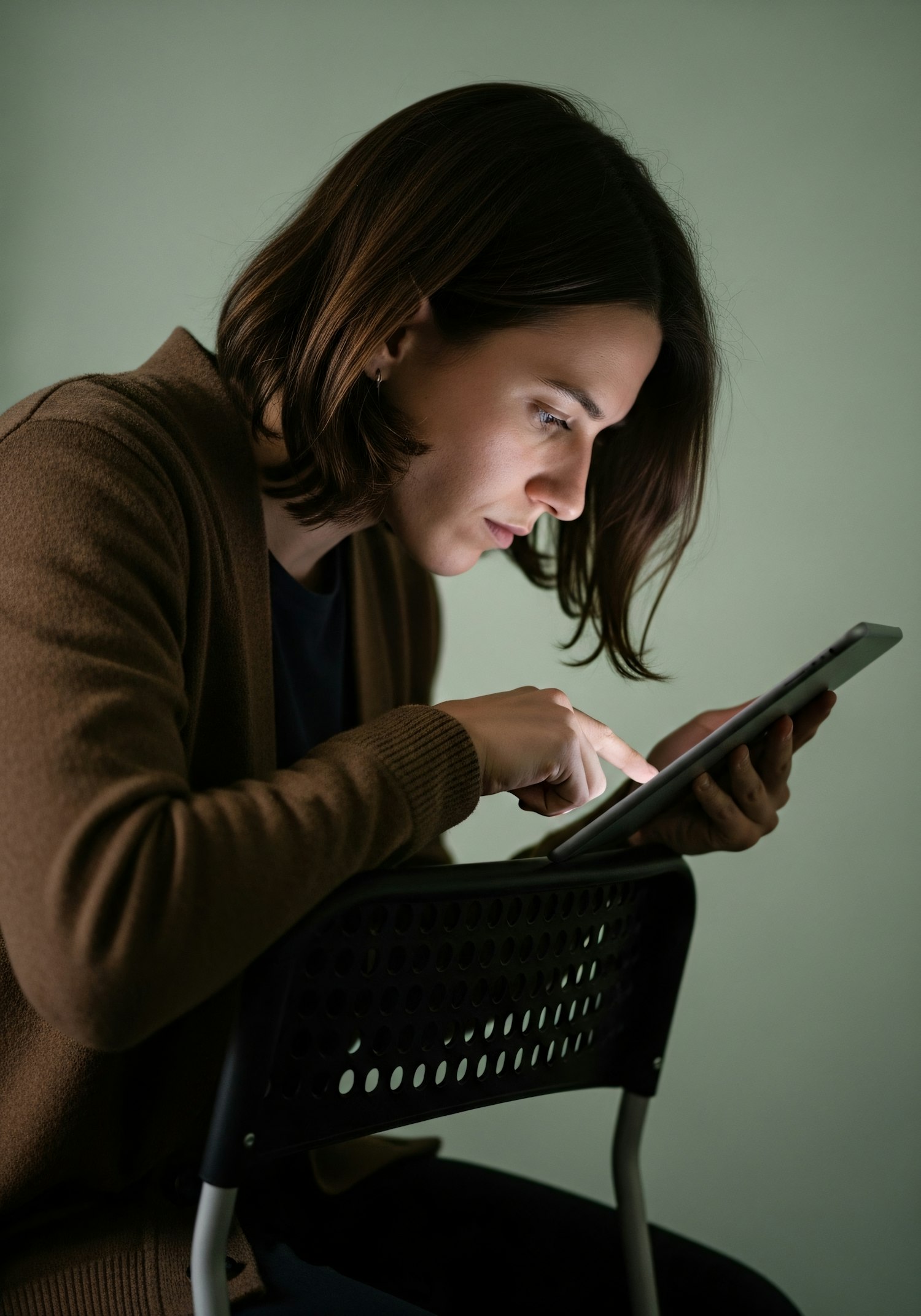 A person seated on a chair, focused on using a tablet, with a soft green background and warm lighting.