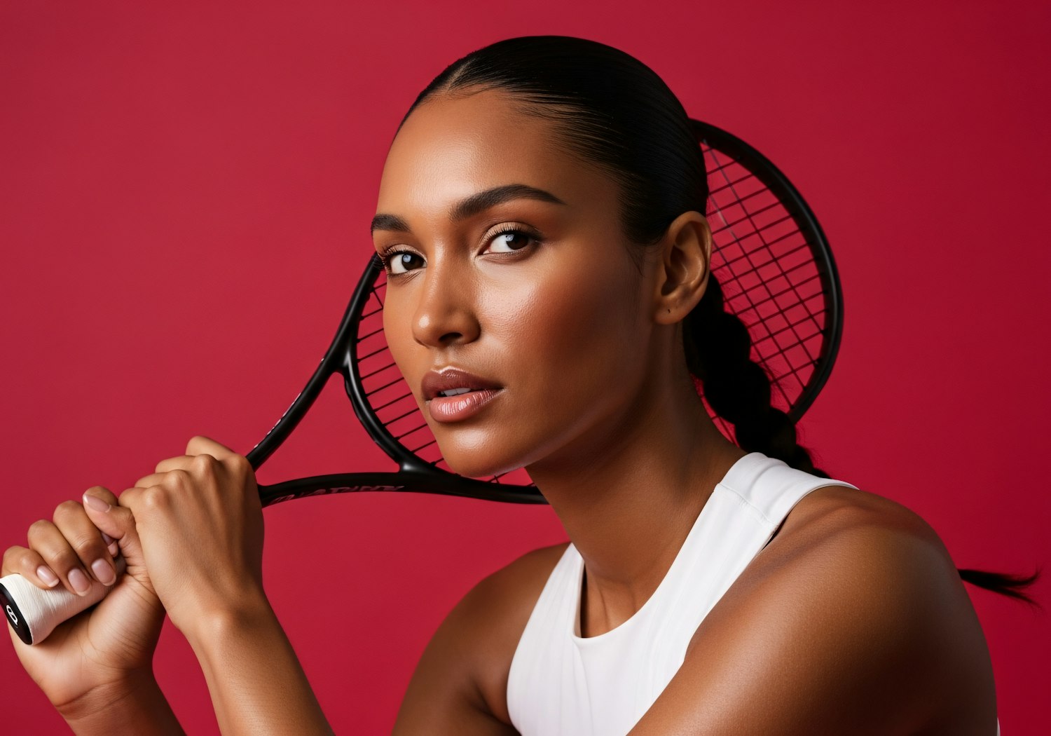 A woman holding a tennis racket against a red background, wearing a white top, with a focused expression and neatly tied-back hair.