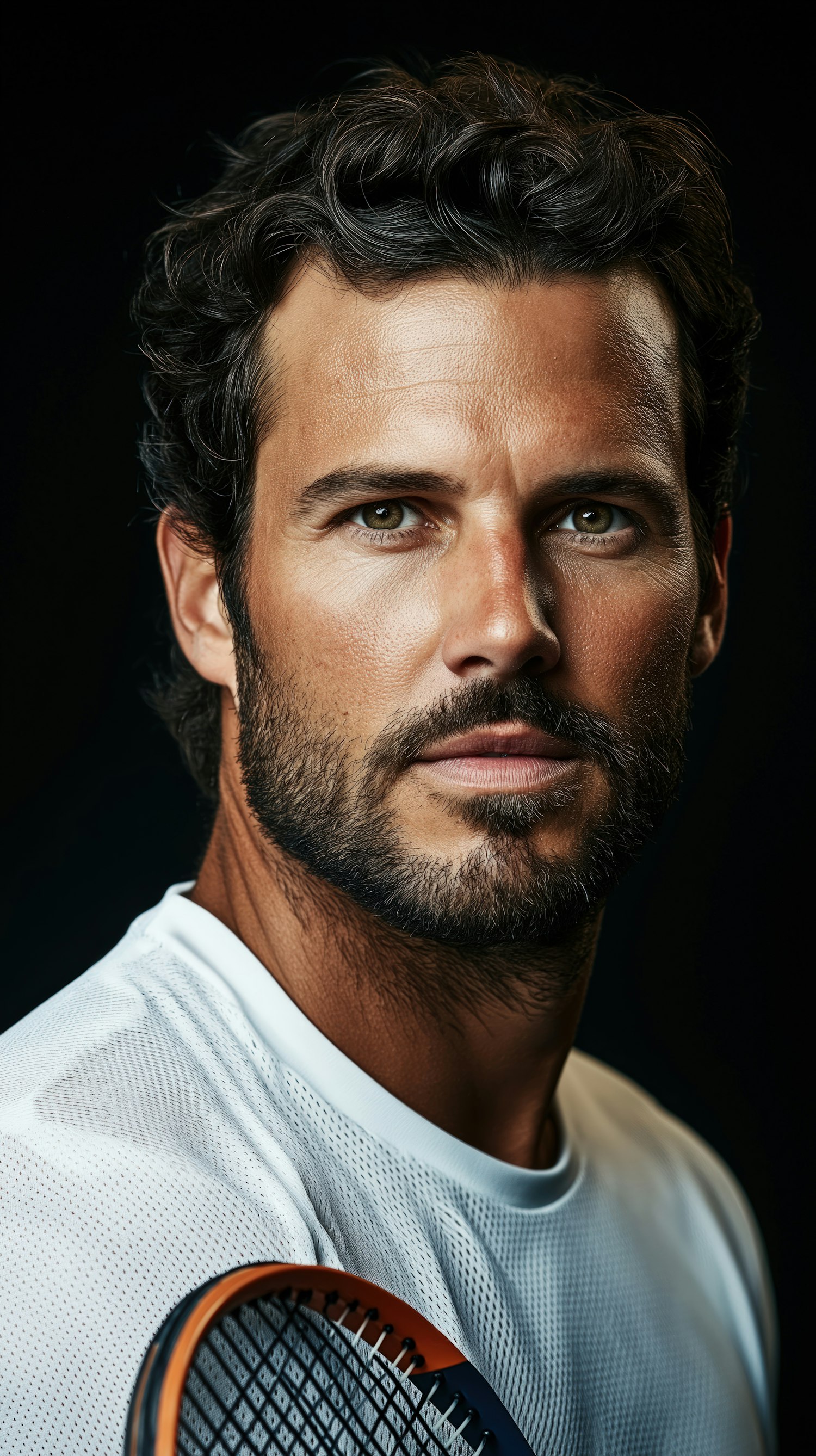 Portrait of a confident man with curly hair and a beard, holding a tennis racket. Intense gaze and white sports shirt stand out.