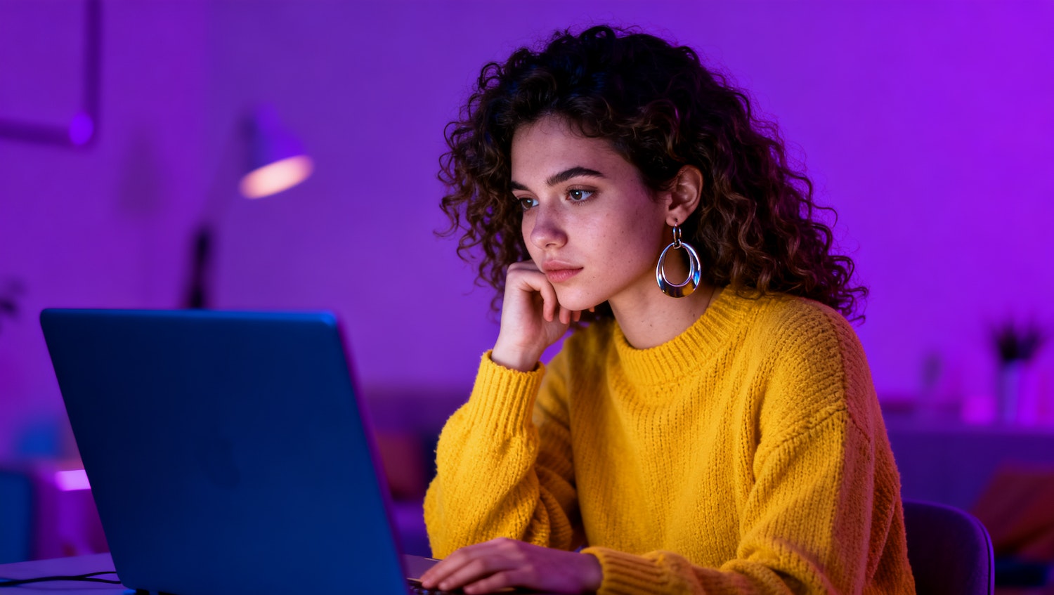 A young woman in a yellow sweater works on her laptop in a purple-lit room, creating a modern and focused atmosphere.