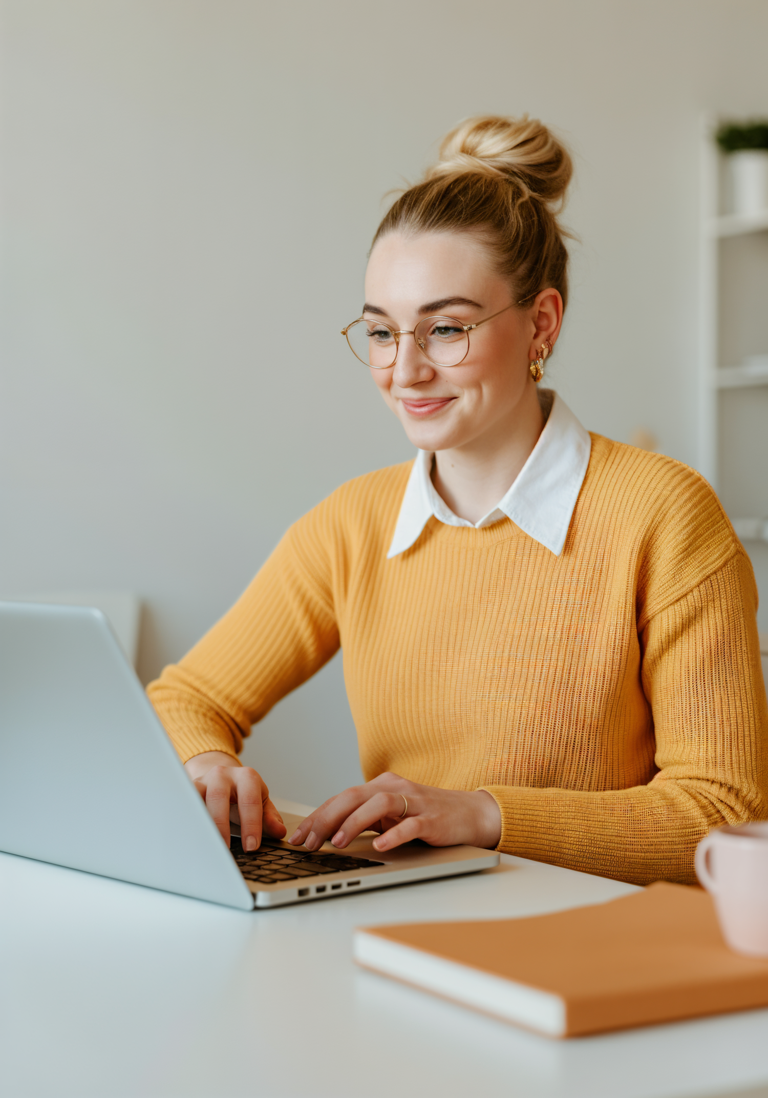 Young woman in glasses and a yellow sweater working on a laptop at a desk with a notebook and coffee mug. Bright and cozy workspace.