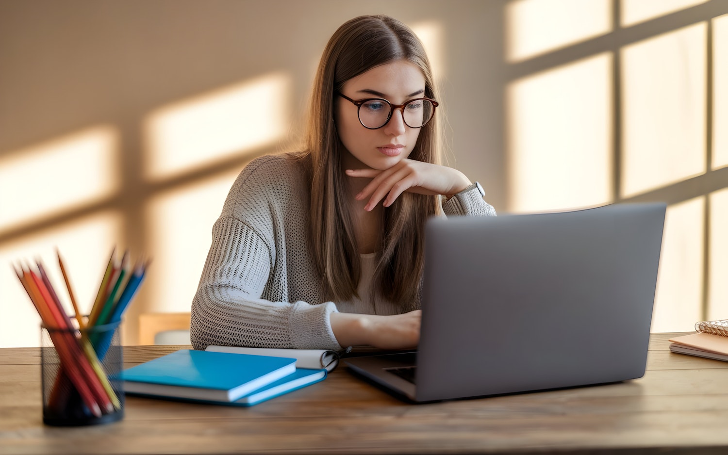 Focused young woman with glasses working on a laptop at a desk, surrounded by colorful stationery and notebooks in warm lighting.