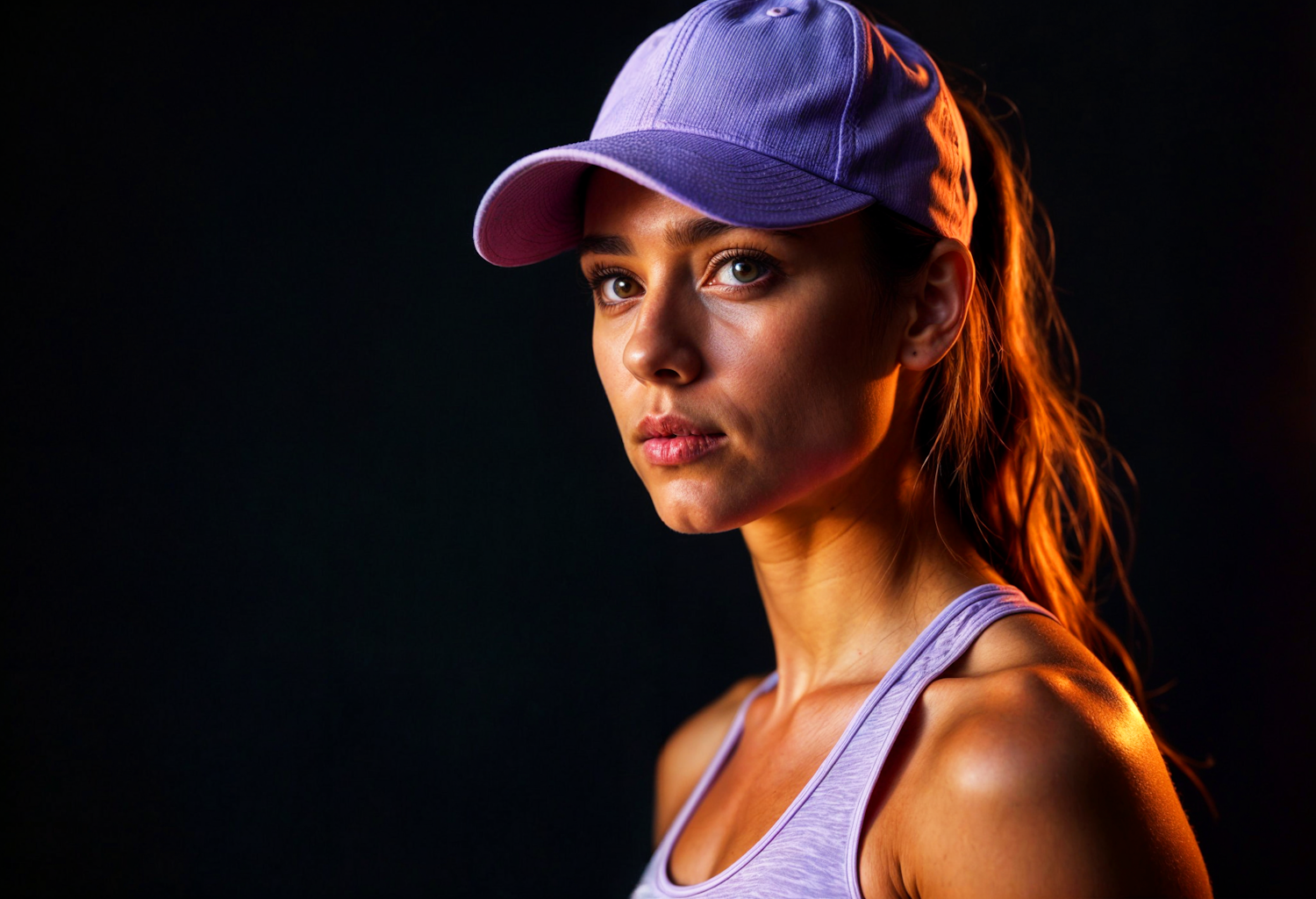 Young woman in purple cap and tank top, dramatic lighting, focused expression, dark background, warm glow on skin.