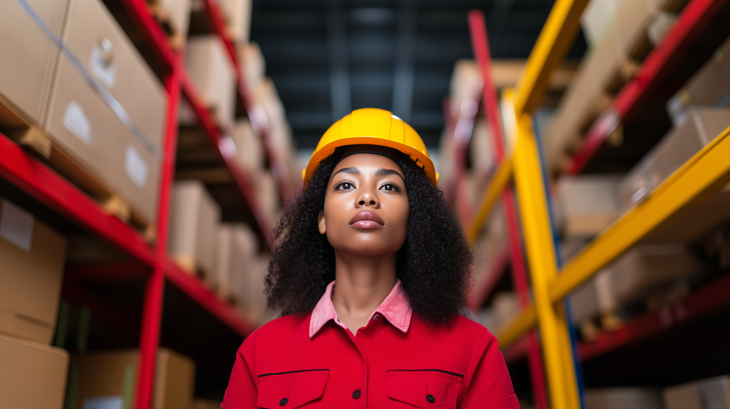 Confident Black woman in a warehouse, wearing a yellow hard hat and red shirt, surrounded by shelves of boxes.