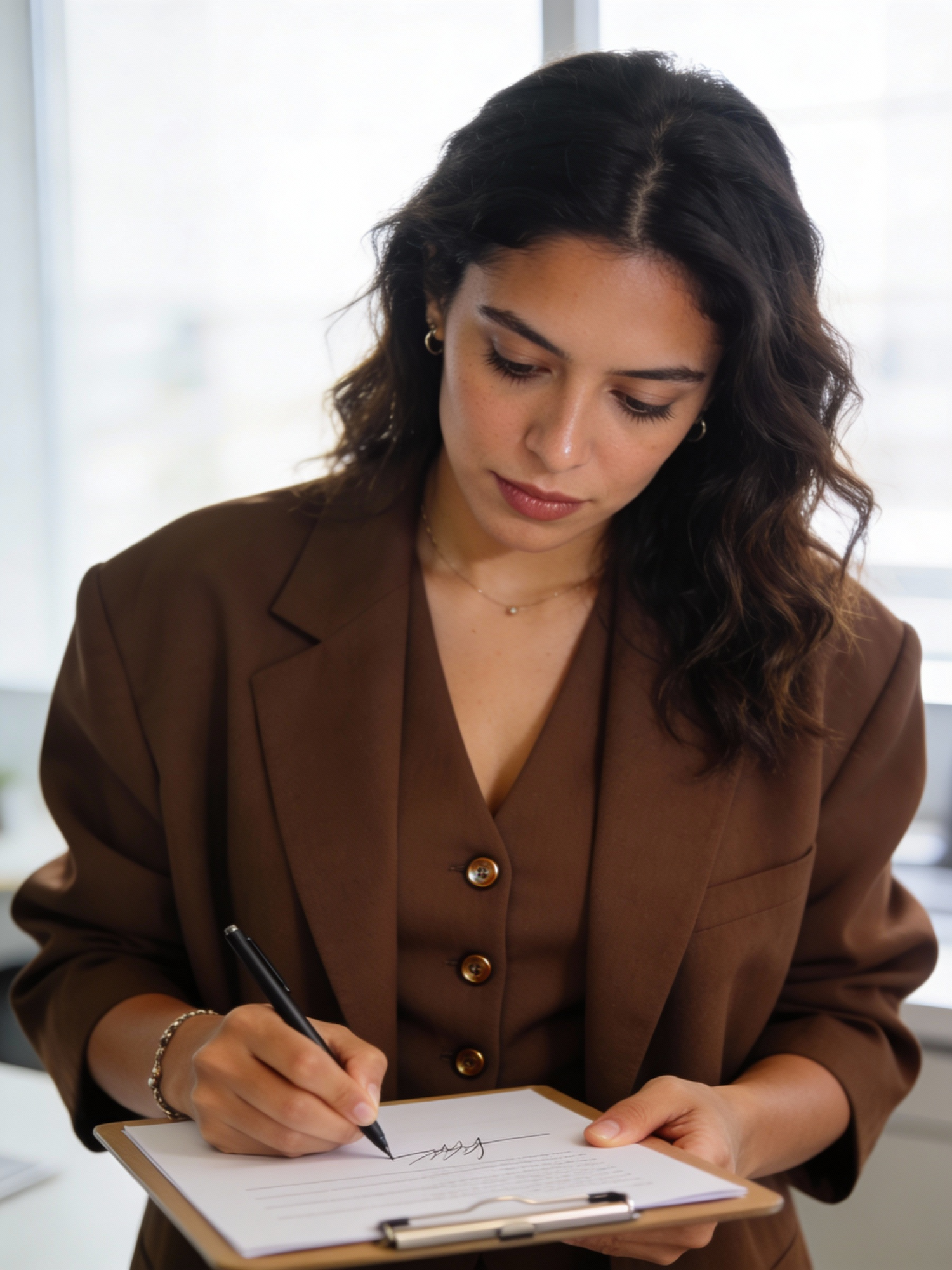 Ultra-realistic professional portrait of a confident Mexican woman, early 30s. Outfit: chocolate-brown oversized blazer over matching buttoned vest (visible buttons), matching trousers implied; minimal jewelry. Hair: wavy loose worn down. Framing: tight head-and-shoulders, centered, eye-level; clipboard visible at the bottom edge. Pose: pen in hand signing near the bottom of a page on a clipboard; other hand stabilizing the clipboard. Not looking at camera; gaze down at the signature area, focused and calm. Props: plain clipboard + paper with blank/abstract content (no readable text), simple pen (no branding). Background: bright contemporary office with soft bokeh, strongly blurred. Lighting: soft window daylight + gentle fill, clean catchlights, subtle rim light, premium corporate/editorial retouch. 85mm look, shallow depth of field, clean neutral warm grade. No readable text, no logos, no watermark.