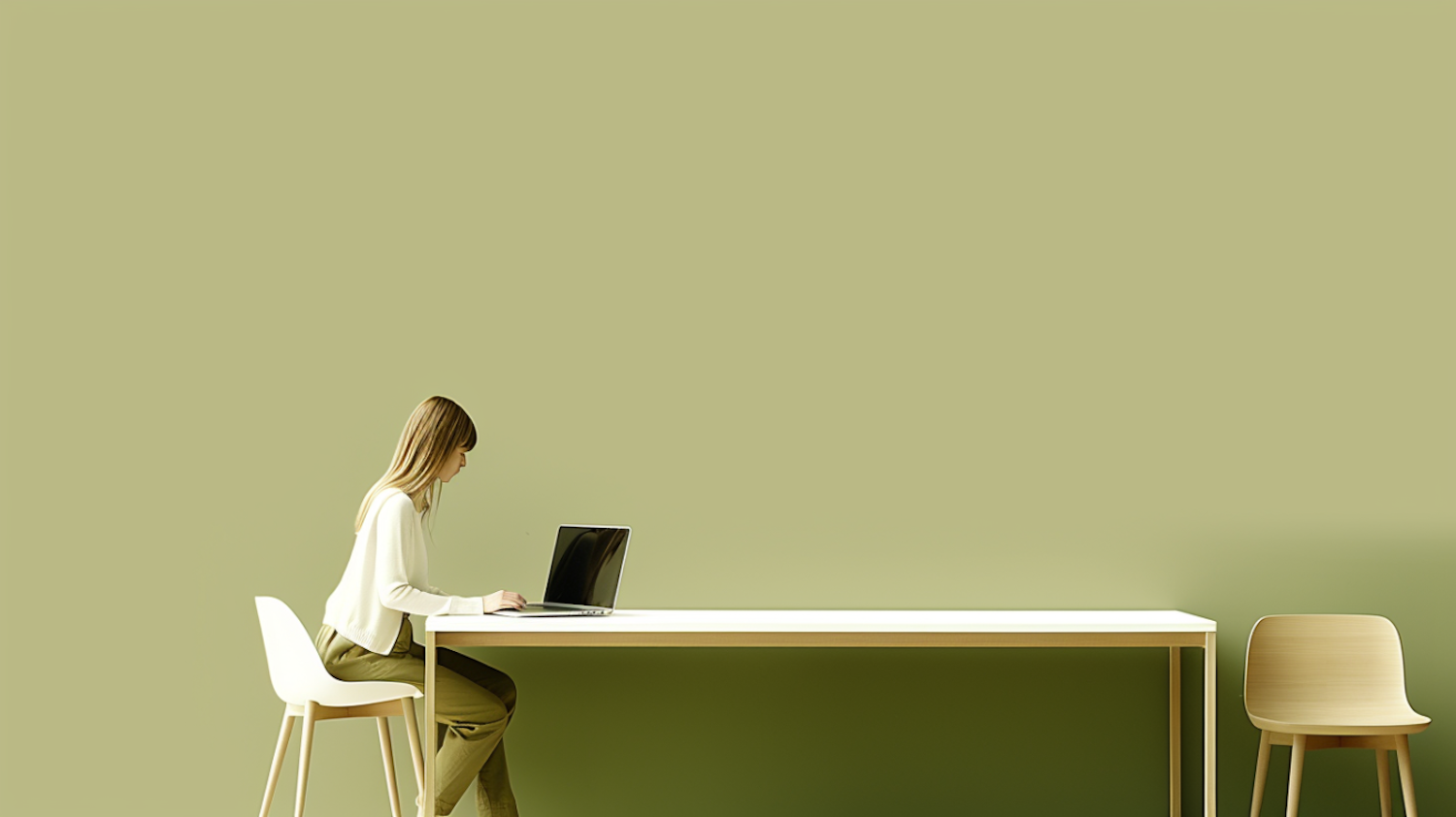 Minimalist workspace with a woman using a laptop at a white table against a green background. Modern and serene setting.