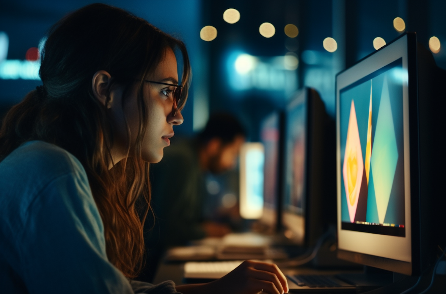 Young woman with glasses focused on a computer screen displaying abstract designs in a dimly lit office setting.
