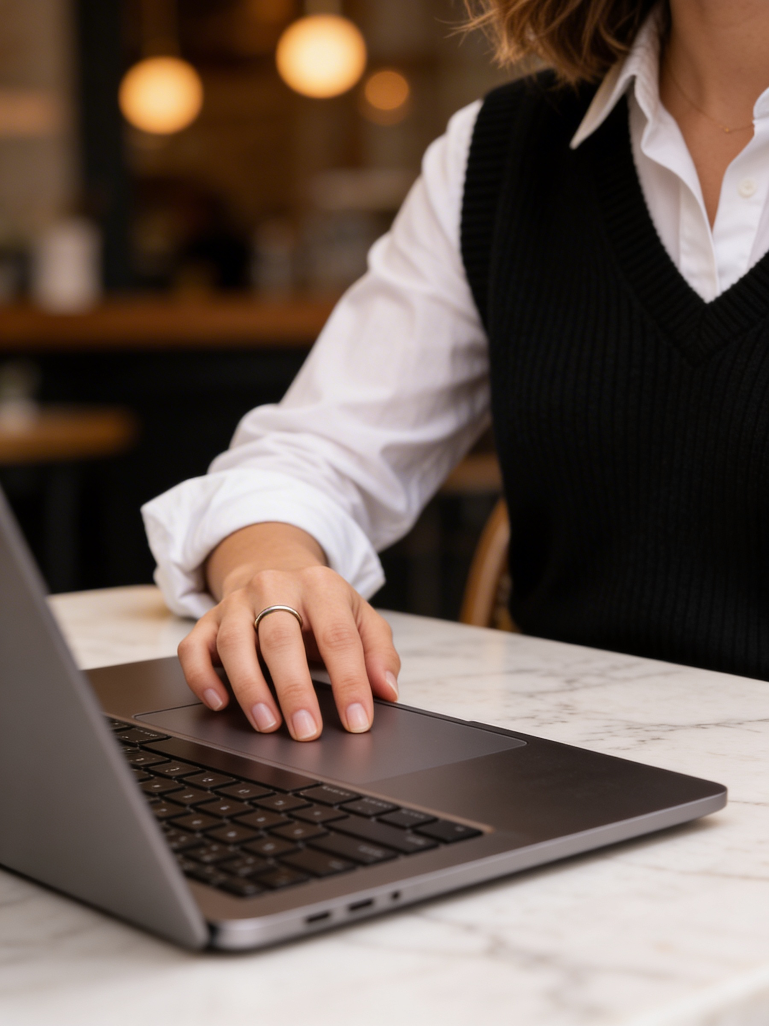 A person working on a laptop at a marble table, wearing a white shirt and black sweater vest, in a cozy, warmly lit environment.