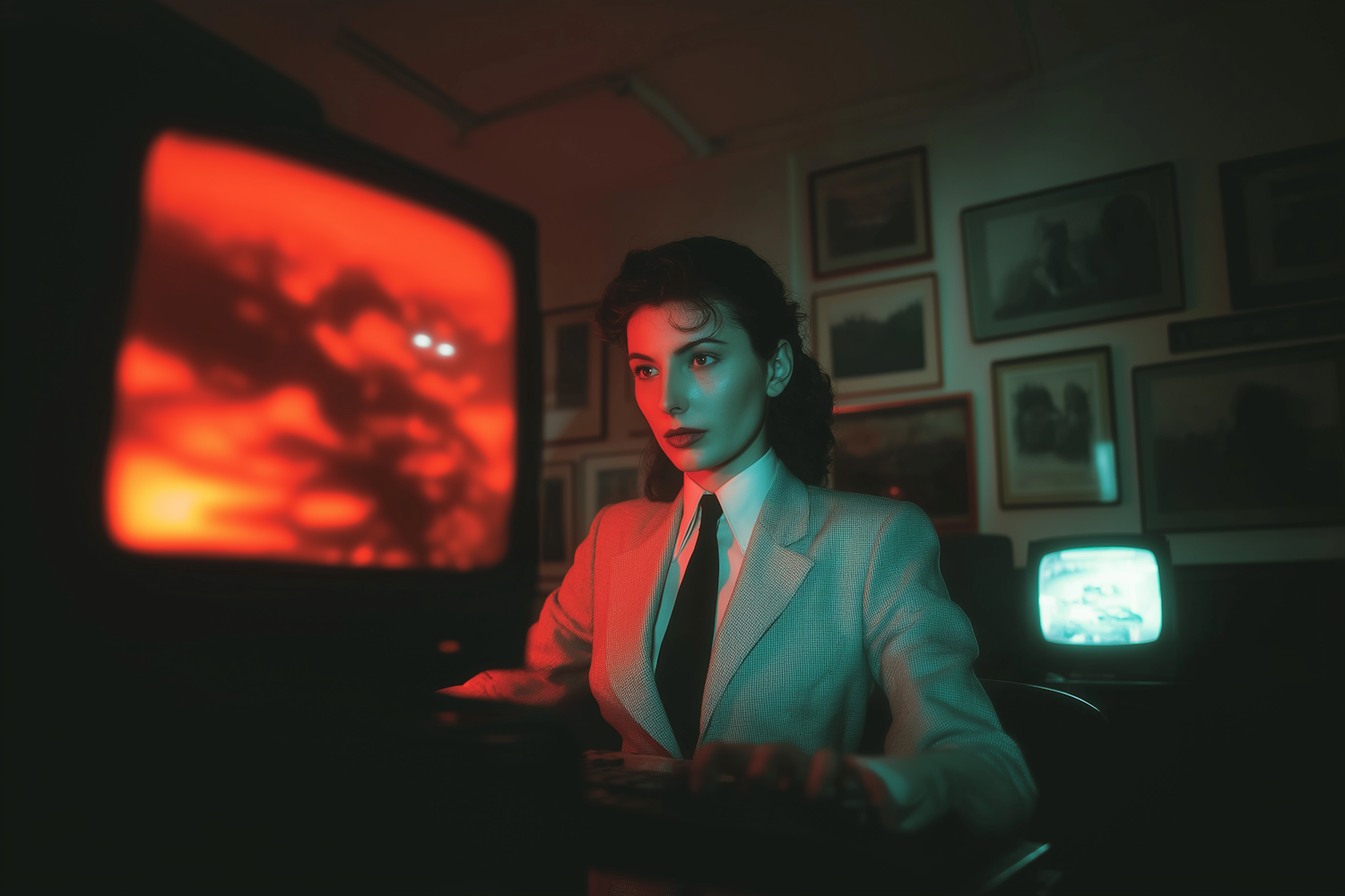 A woman in a suit works at a computer in a dimly lit room, illuminated by red and blue monitor lights, creating a dramatic atmosphere.