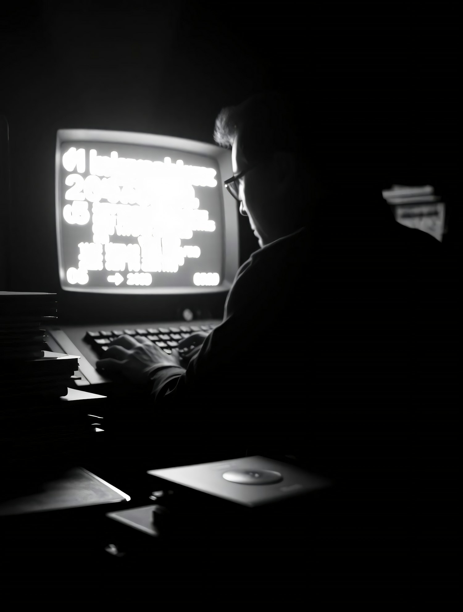 A person working at a computer in a dark room, illuminated by the screen, surrounded by stacks of books and documents.