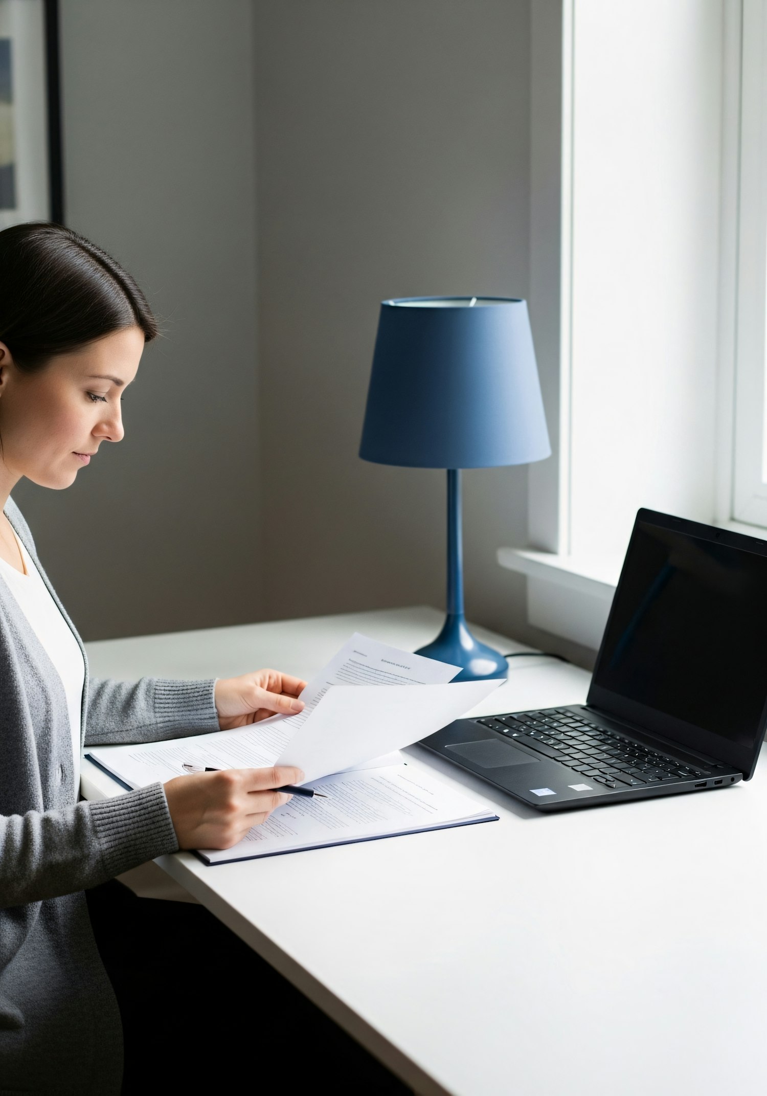 A woman reviews documents at a desk with a laptop and a blue lamp, in a bright and minimalistic workspace.