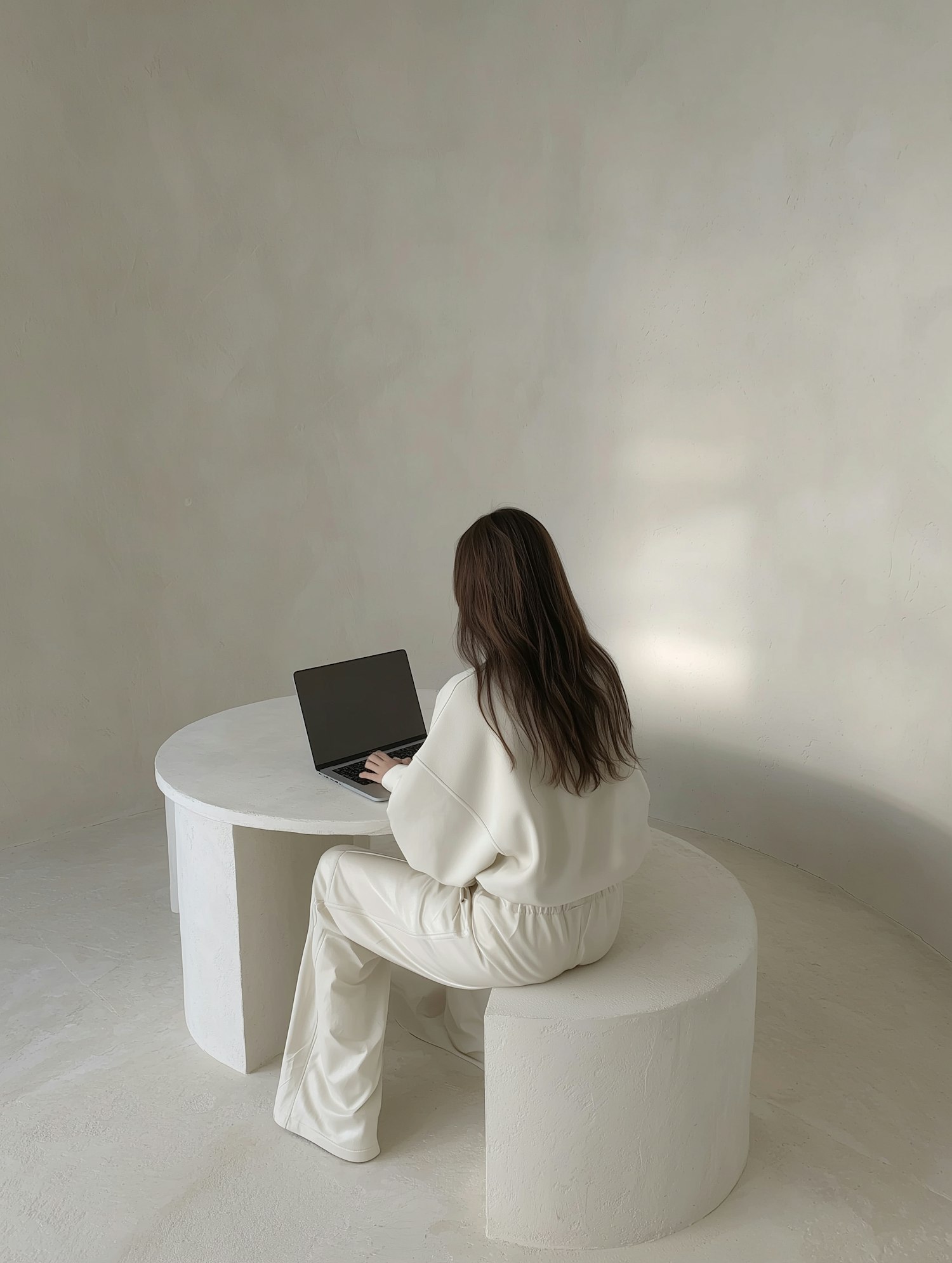 A person in a white outfit works on a laptop at a minimalist white table in a serene, neutral-toned setting with soft lighting.