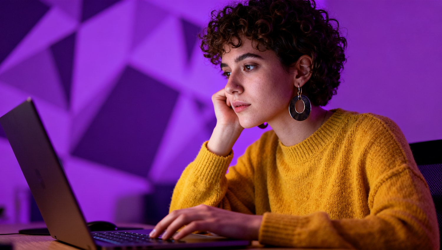A person in a yellow sweater works on a laptop in a purple-lit room with geometric patterns, creating a focused and modern vibe.