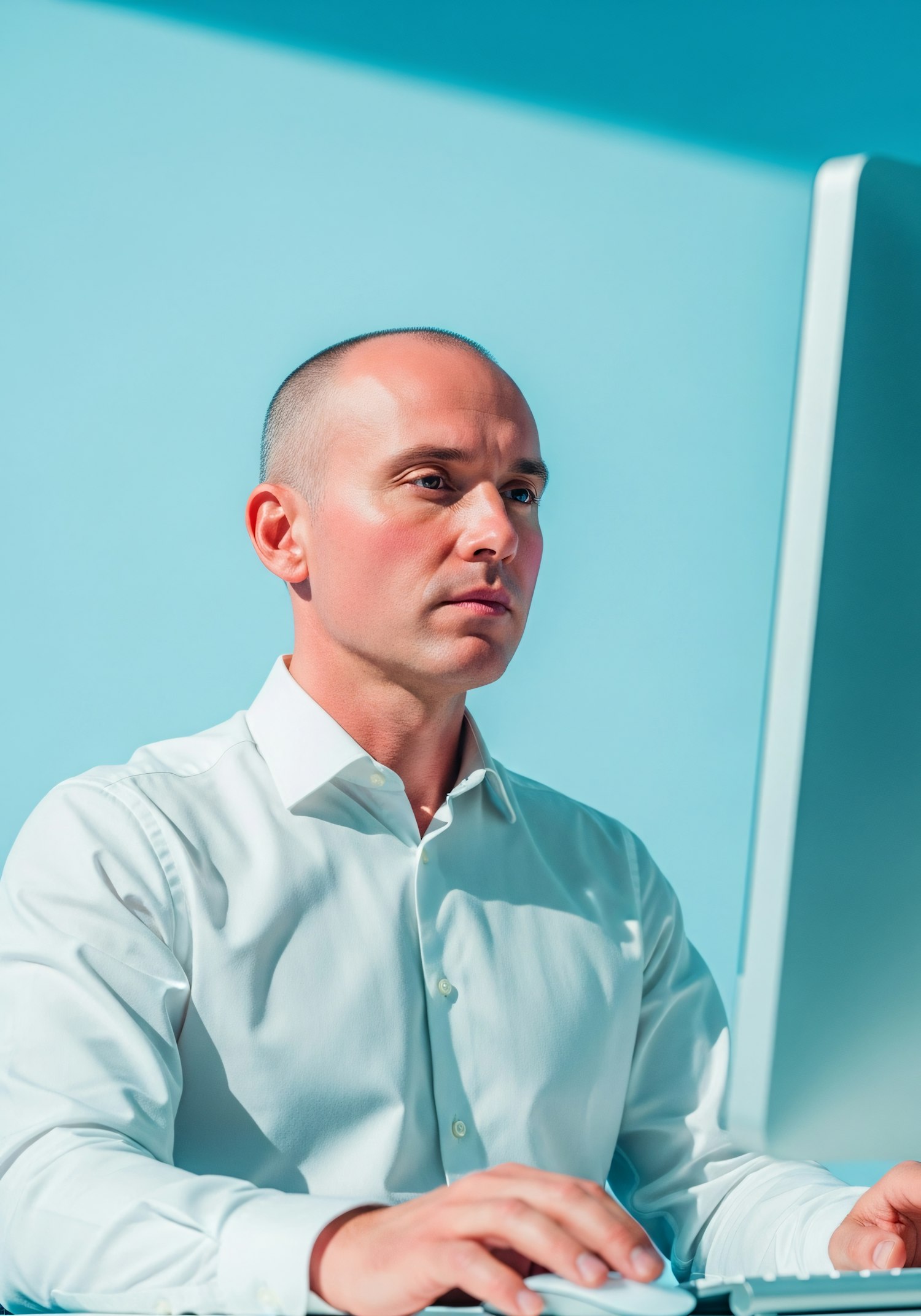 A professional man in a white shirt works at a computer against a clean blue background, conveying focus and modernity.