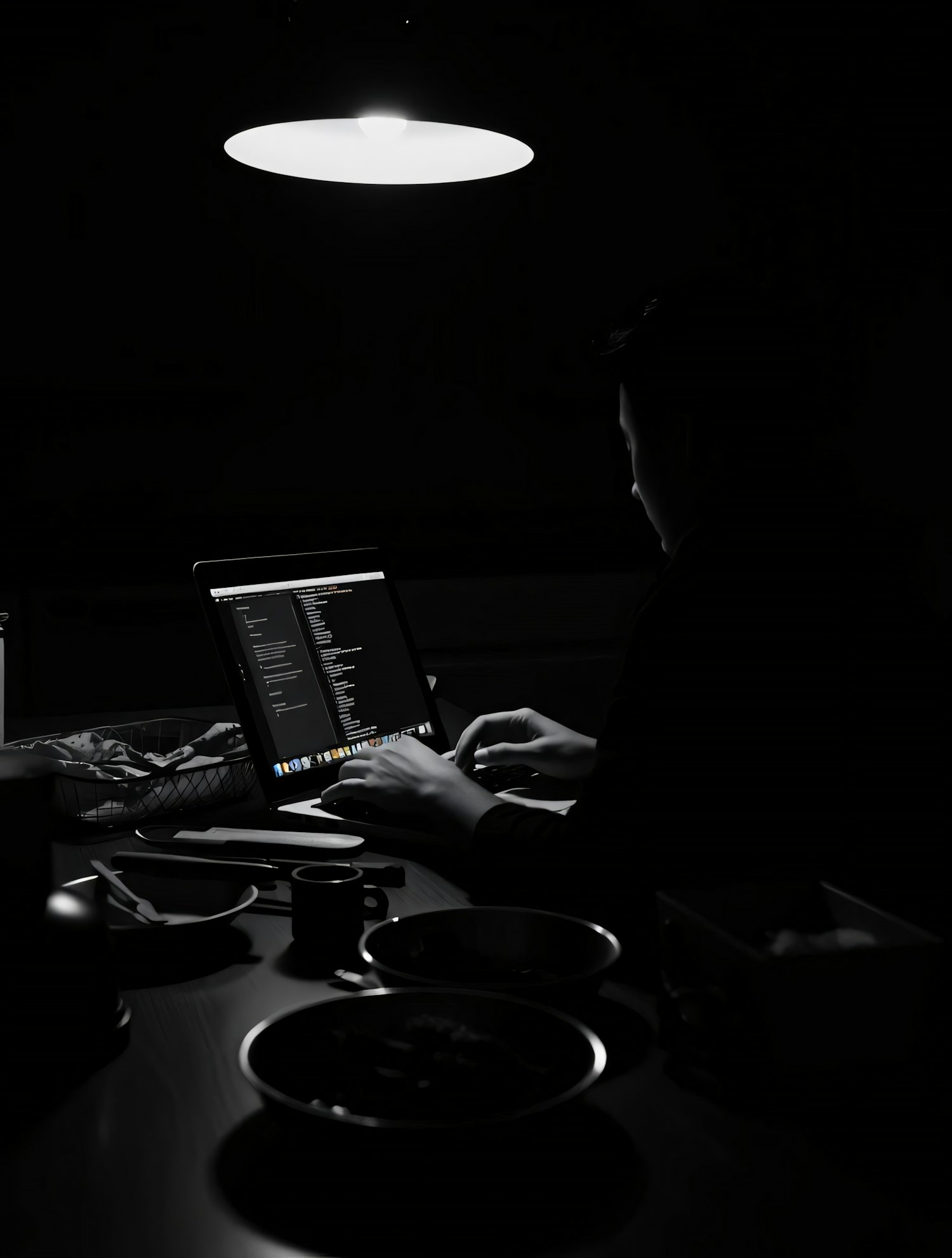 A person working on a laptop in a dimly lit room, illuminated by a single overhead light, creating a focused and dramatic atmosphere.